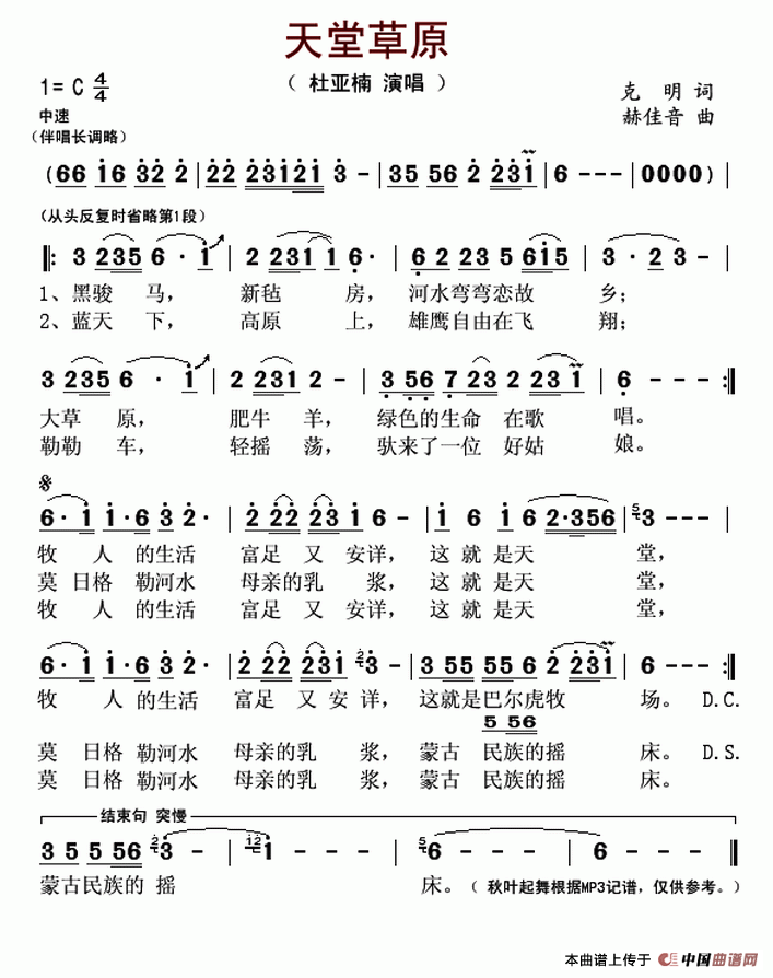 天堂草原(克明词 赫佳音曲)相关五线谱
