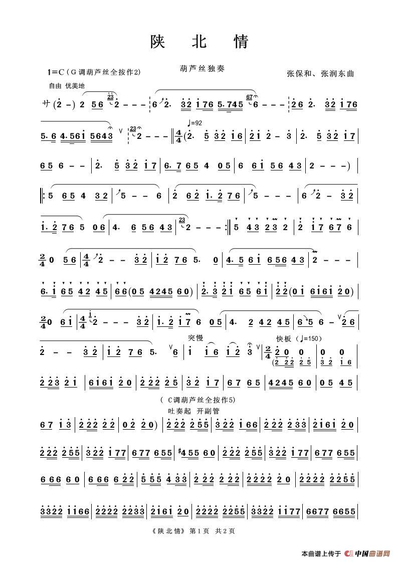 陕北情(筒音作2)(葫芦丝独奏)相关五线谱