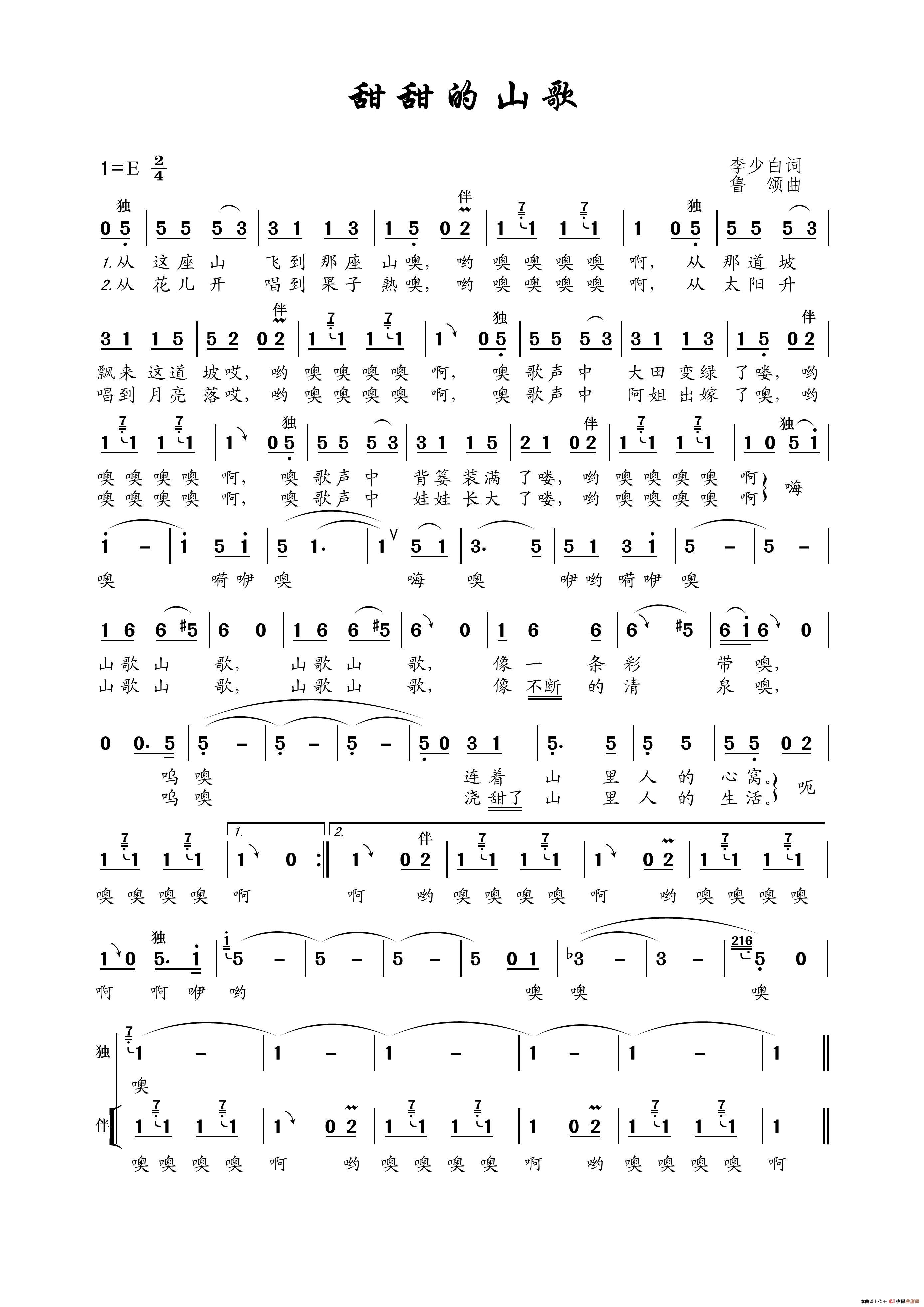 鲁颂曲谱推荐母爱是海(廖泽川词 鲁颂曲、正谱)瑶家小百灵小小芦笙手(廖泽川词 鲁颂曲、二重唱)幸福的日子唱着过(李隆汉词 鲁颂曲)爱的火辣辣好梦(电视剧《桃花寨的故事》主题曲)湘西,美丽的地方土家撒叶儿荷自己去吧我们的怀里(正谱)永远的党旗跳春光(佟文西词 鲁颂曲)银月亮 . 金太阳家在乡下金太阳银月亮(邝厚勤词 鲁颂曲)竹韵井冈情(廖泽川词 鲁颂曲)今年春天绿得早山村趣事多请喝芝麻豆子茶