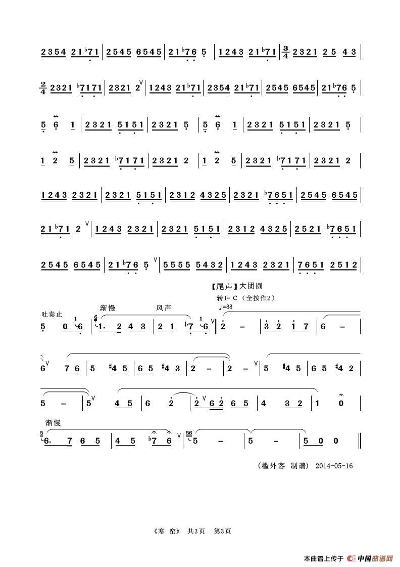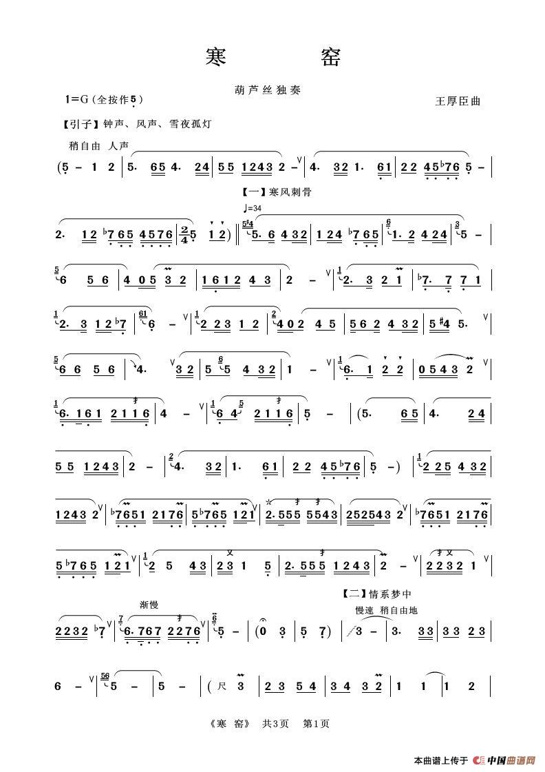 寒窑(葫芦丝独奏)相关五线谱