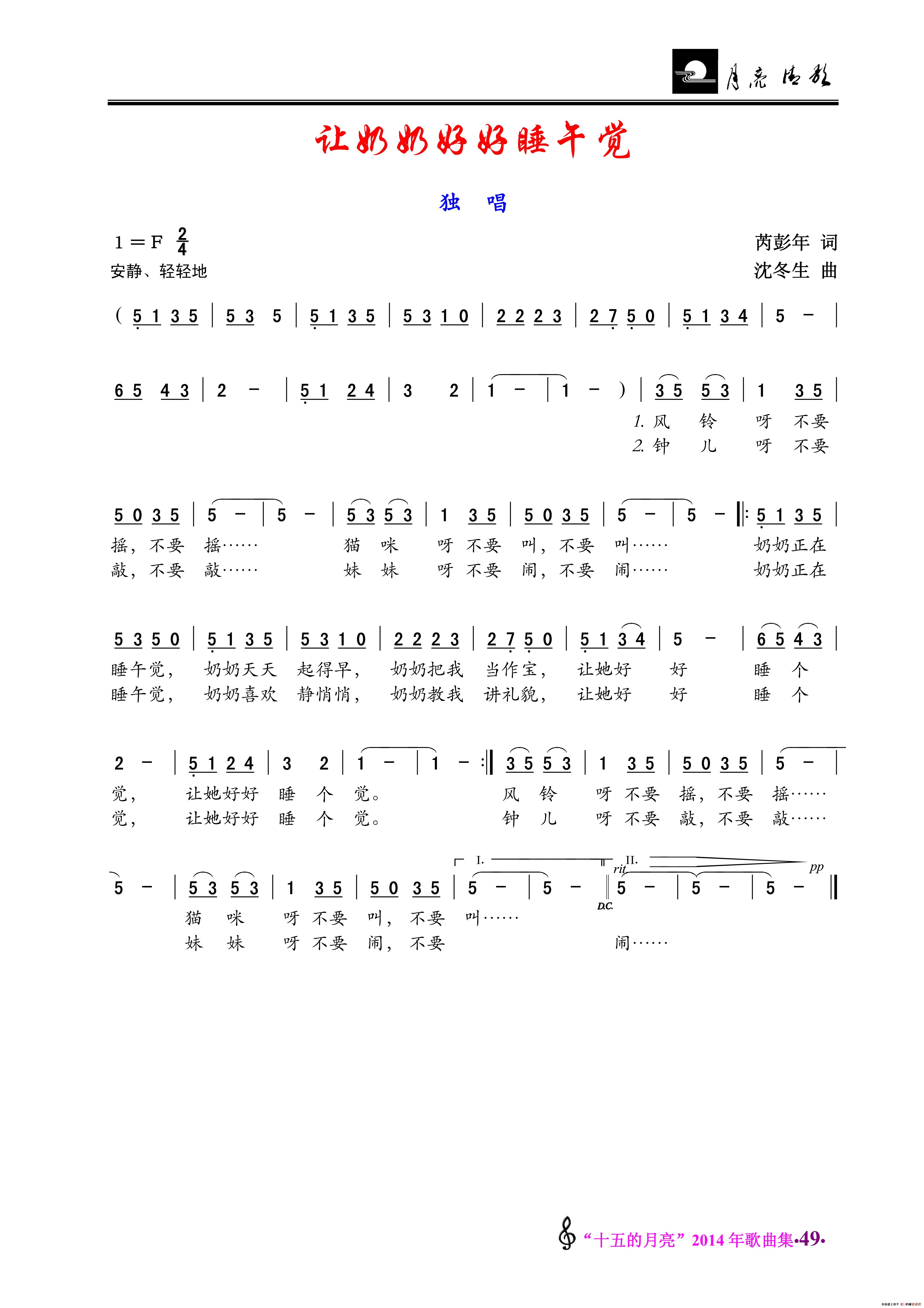 沈冬生曲谱推荐微笑是个开心果妈妈的天气预报不给大家添麻烦唱给教师的歌让奶奶好好睡午觉我想回家(李莉词 沈冬生曲)花开的声音(李成福词 沈冬生曲)叔叔,快把枪放下小鸟与梅花鹿(张树礼词 沈冬生曲)彩色风铃美丽(芮彭年词 沈冬生曲)甜蜜的小雨(李严词 沈冬生曲)蜡笔女生彩色风铃我是一朵幸福花快乐的少先队(晨枫词 沈冬生曲)林中晨曲(周励词 沈冬生曲)中国的梦最甜(芮彭年词 沈冬生曲)我在春天里长大天蓝蓝,海蓝蓝,梦蓝蓝