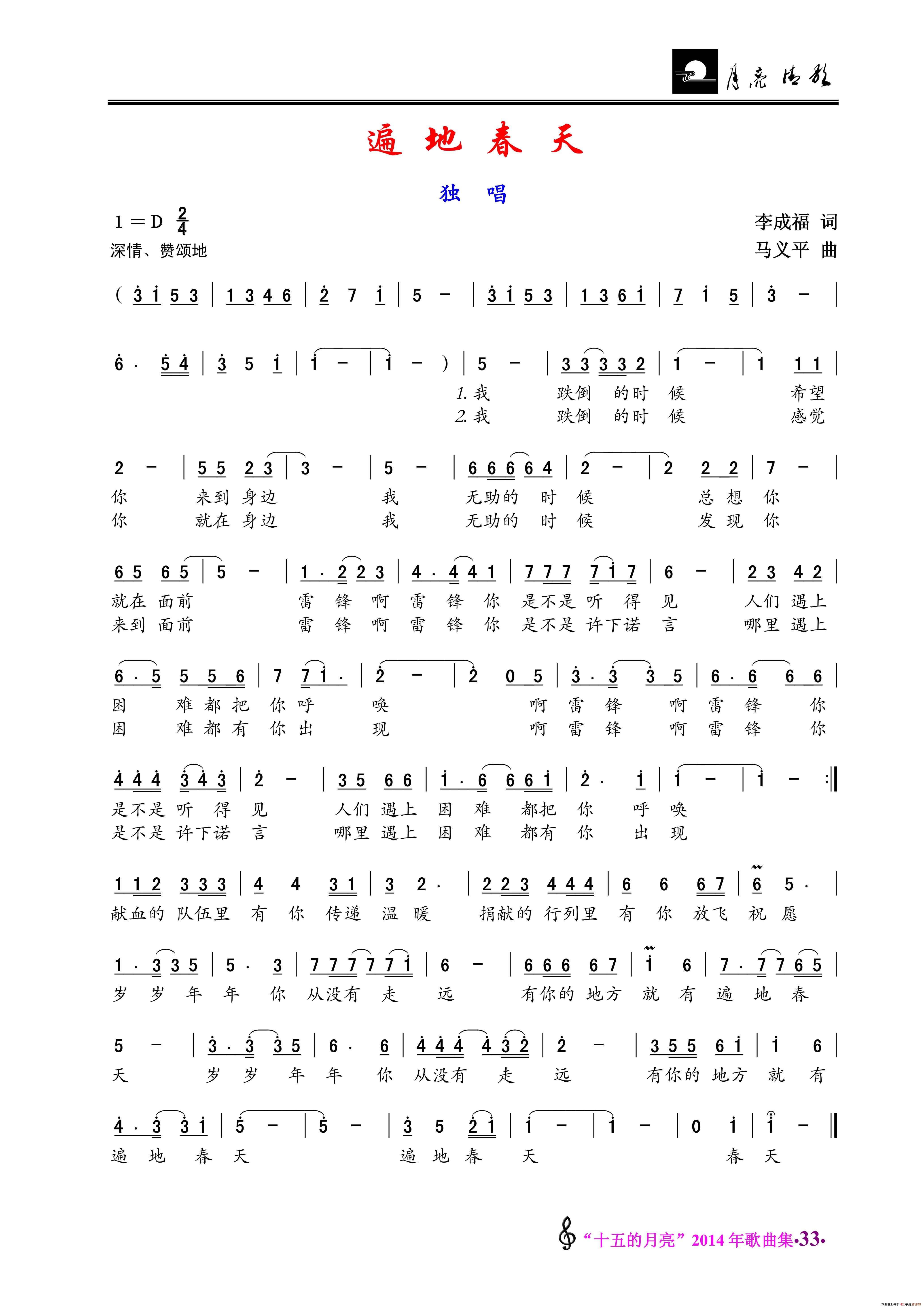 马义平曲谱推荐遍地春光我的中国梦(李成福词 马义平曲)唱给党的歌浦东郊外的篝火(女声独唱)奔跑吧,青春同心家园婆婆也是妈(许如忠词 马义平曲)中南海(王宏昭词 马义平曲)亮剑(许如忠词 马义平曲、男声小合唱)动起来(李成福词 马义平曲)若有战、必召回(男声小合唱)护照我们是你的队伍海阔天高(李成福词 马义平曲)苏州河上十八湾同心家园(主题歌)