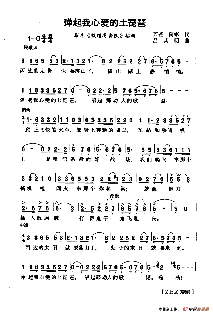 吕其明曲谱推荐少先队进行曲十娘怒(电影《杜十娘》插曲)谁不说俺家乡好(爵士乐版)红旗颂(萨克斯四重奏总谱)红旗颂(薛锡祥填词 吕其明作曲、二部合唱)弹起我心爱的土琵琶(电影《铁道游击队》插曲)飞向远方的故乡(故事影片《庐山恋》主题歌)弹起我心爱的土琵琶(电影《铁道游击队》插曲)弹起我心爱的土琵琶(二部合唱)笼儿不是鸟的家(乔羽词 黄准、吕其明曲)谁不说俺家乡好春天,我欢呼你的到来弹起我心爱的土琵琶微山湖(二胡曲谱)微山湖(二重唱)到美丽的大自然去(故事片《闪光的彩球》插曲)红旗颂(四重奏上低音萨克斯分谱)奉献之歌(张鸿西词 吕其明曲)弹起我心爱的土琵琶(另一版)啊,秋海棠(电视剧《秋海棠》主题曲)