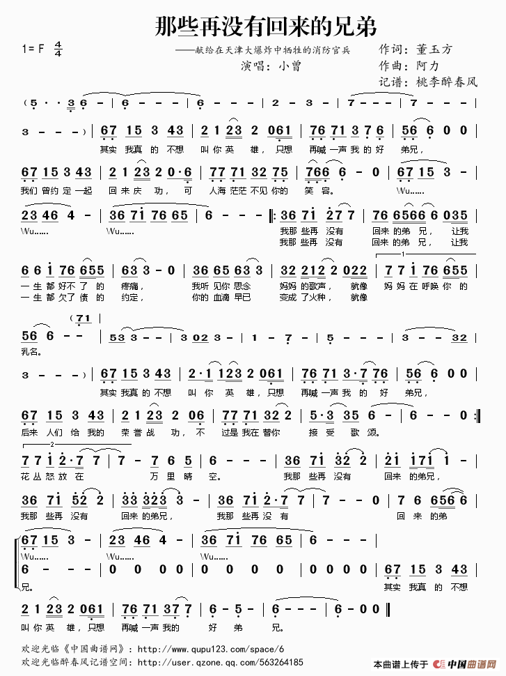那些再没有回来的兄弟(献给在天津大爆炸中牺牲的消防官兵)相关五线谱