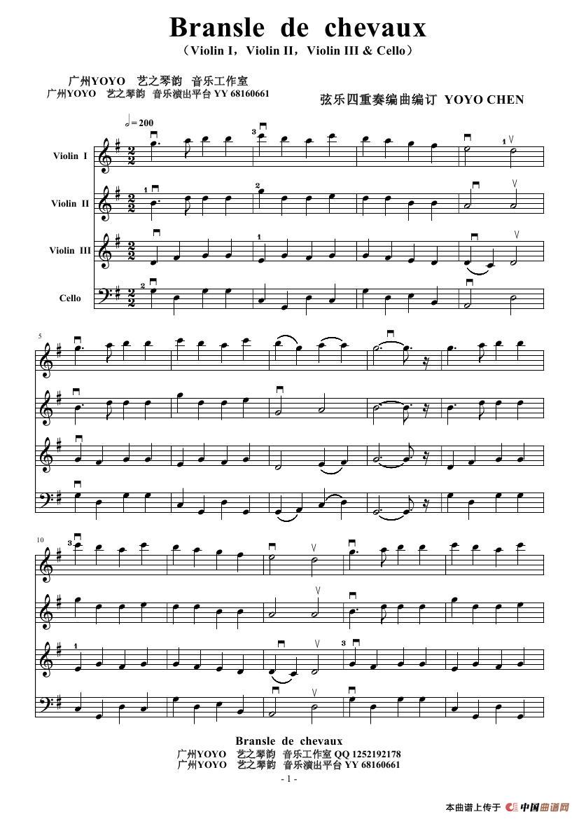 (弦乐四重奏)Bransle de chevaux(小提琴和大提琴)相关五线谱