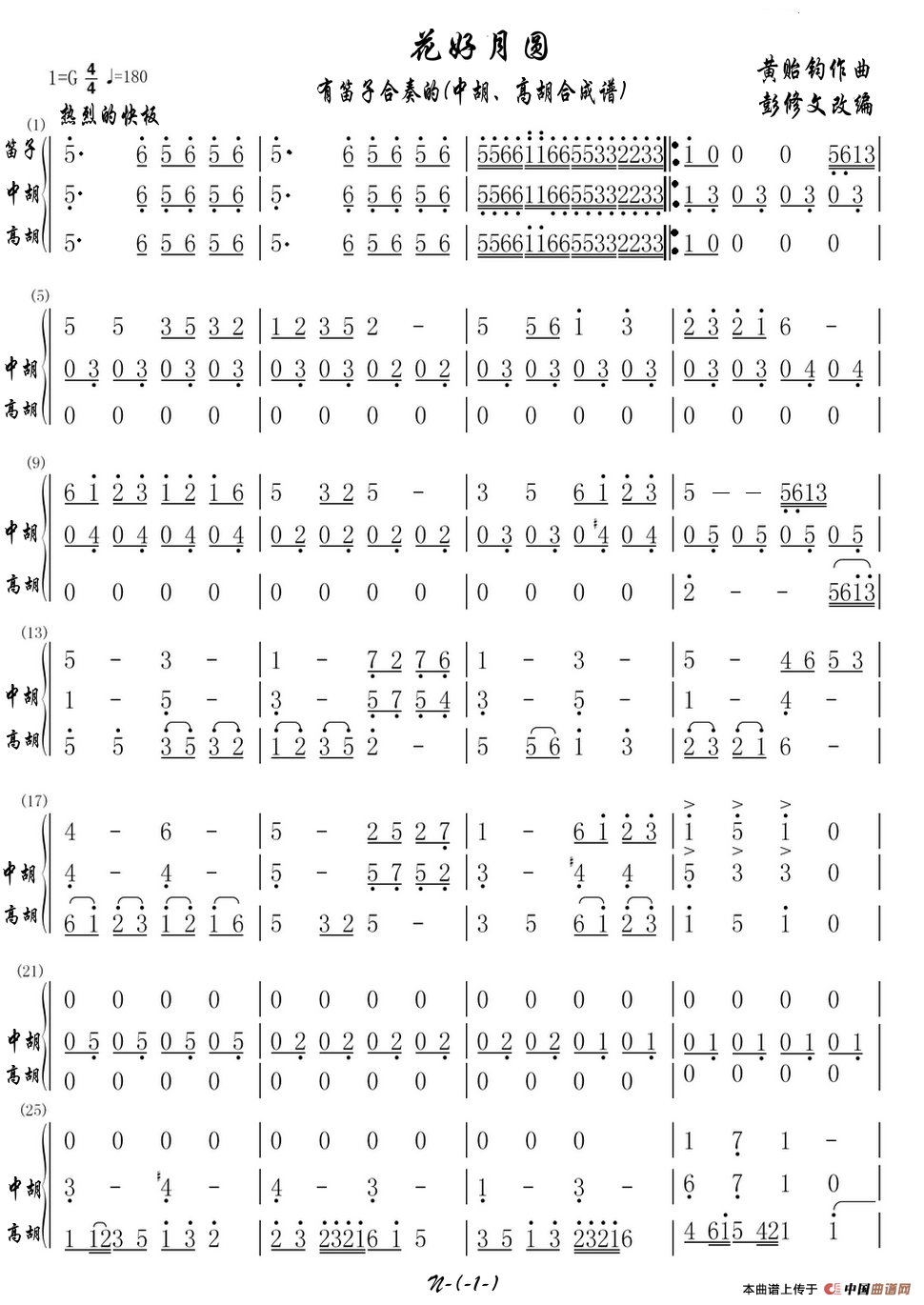 花好月圆(与笛子合奏的(中胡高胡合成分谱))相关五线谱