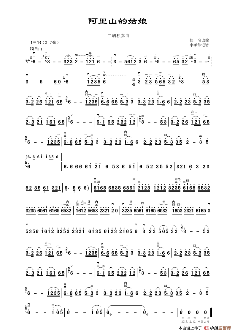 阿里山的姑娘(二胡独奏曲)相关五线谱