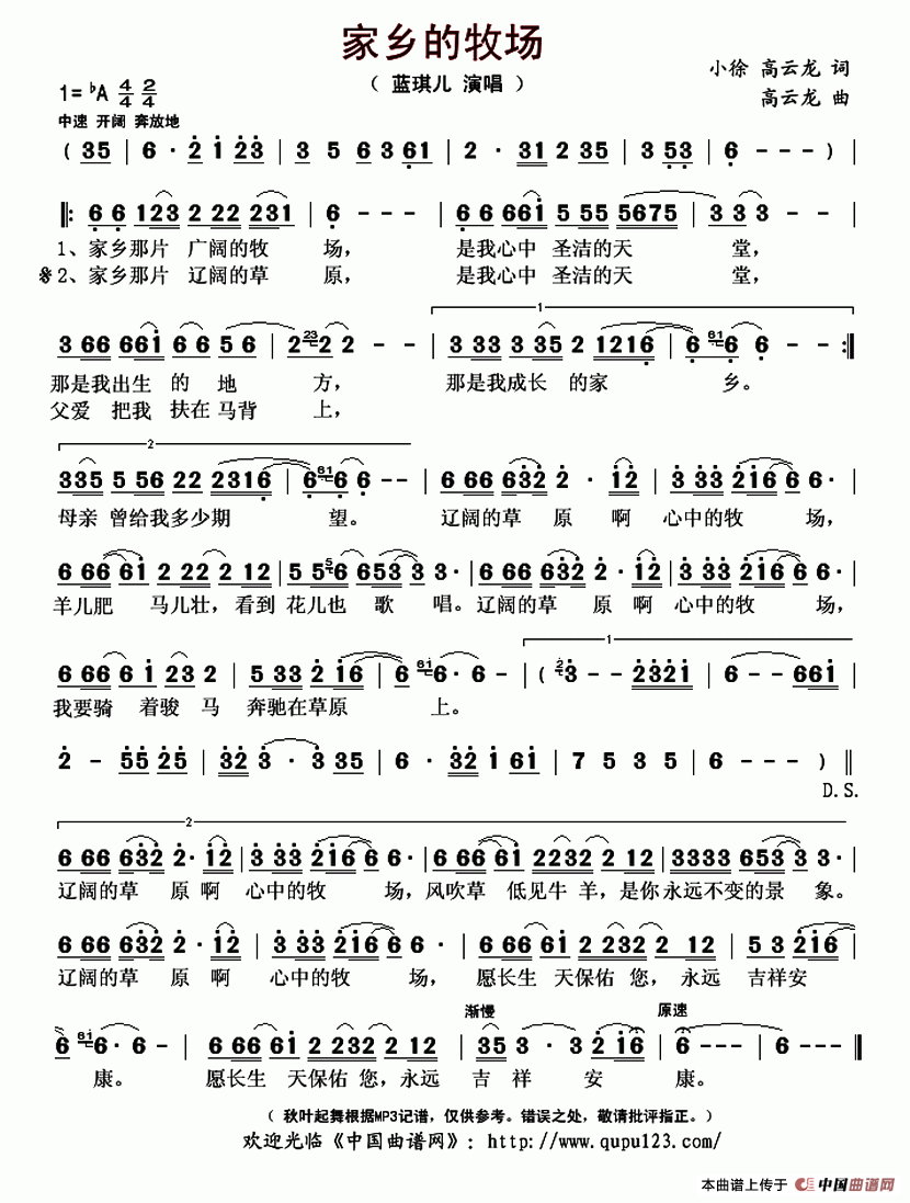 家乡的牧场相关五线谱