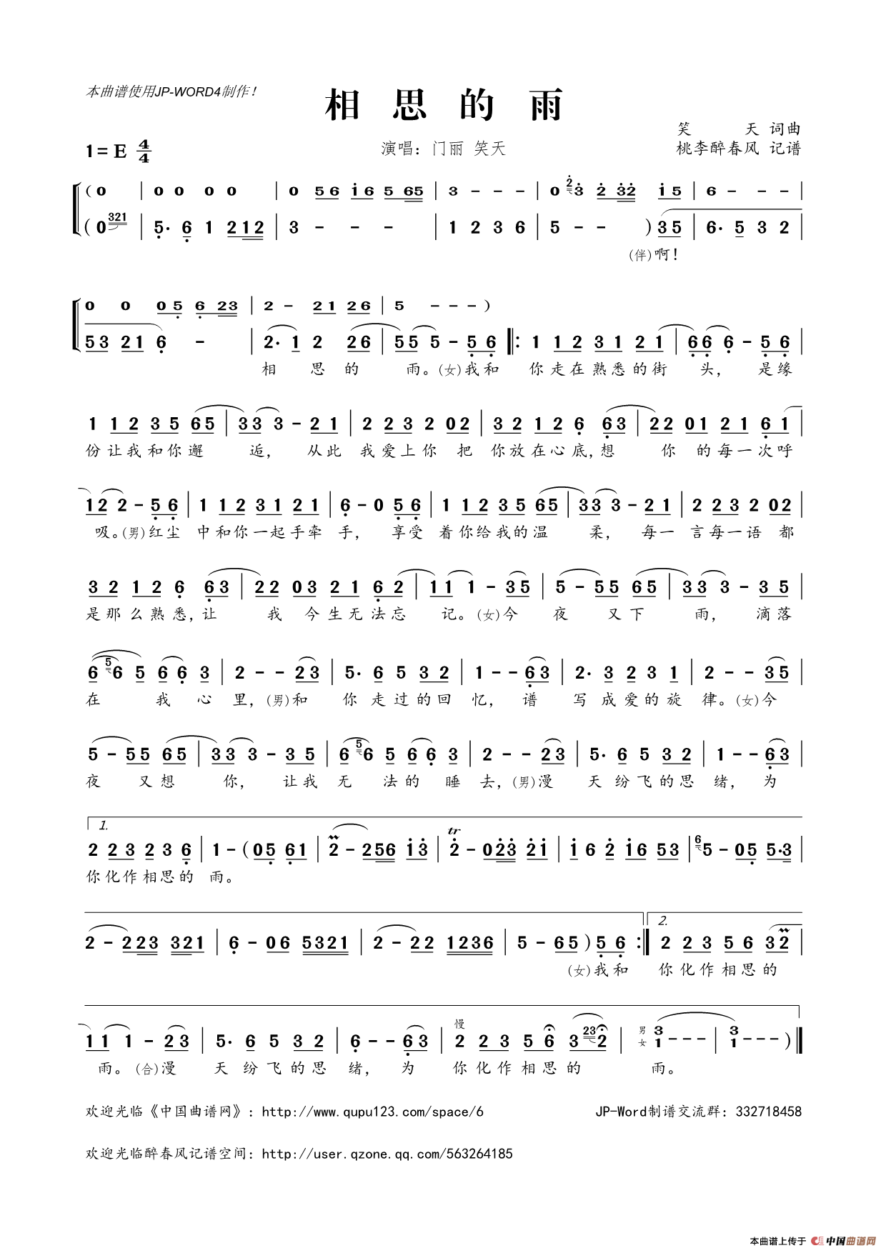 笑天曲谱推荐等你等到白了头既然有了她在你身边一切皆是梦雁影分飞长歌清明祭(焦响制谱)你把我的爱撕成了碎片男人(笑天词 笑天曲)让雪花带走我的思念爱情没有期限相思雨快手情缘苍天不负有情人(王立生词笑天曲)当男人流泪的时候别说你有多爱我我想爱你过客(笑天词曲)后悔没有珍惜你(余云飞词 笑天曲)我想有个安稳的家红尘叹等风等雨不如等你(郭高见词 笑天曲)