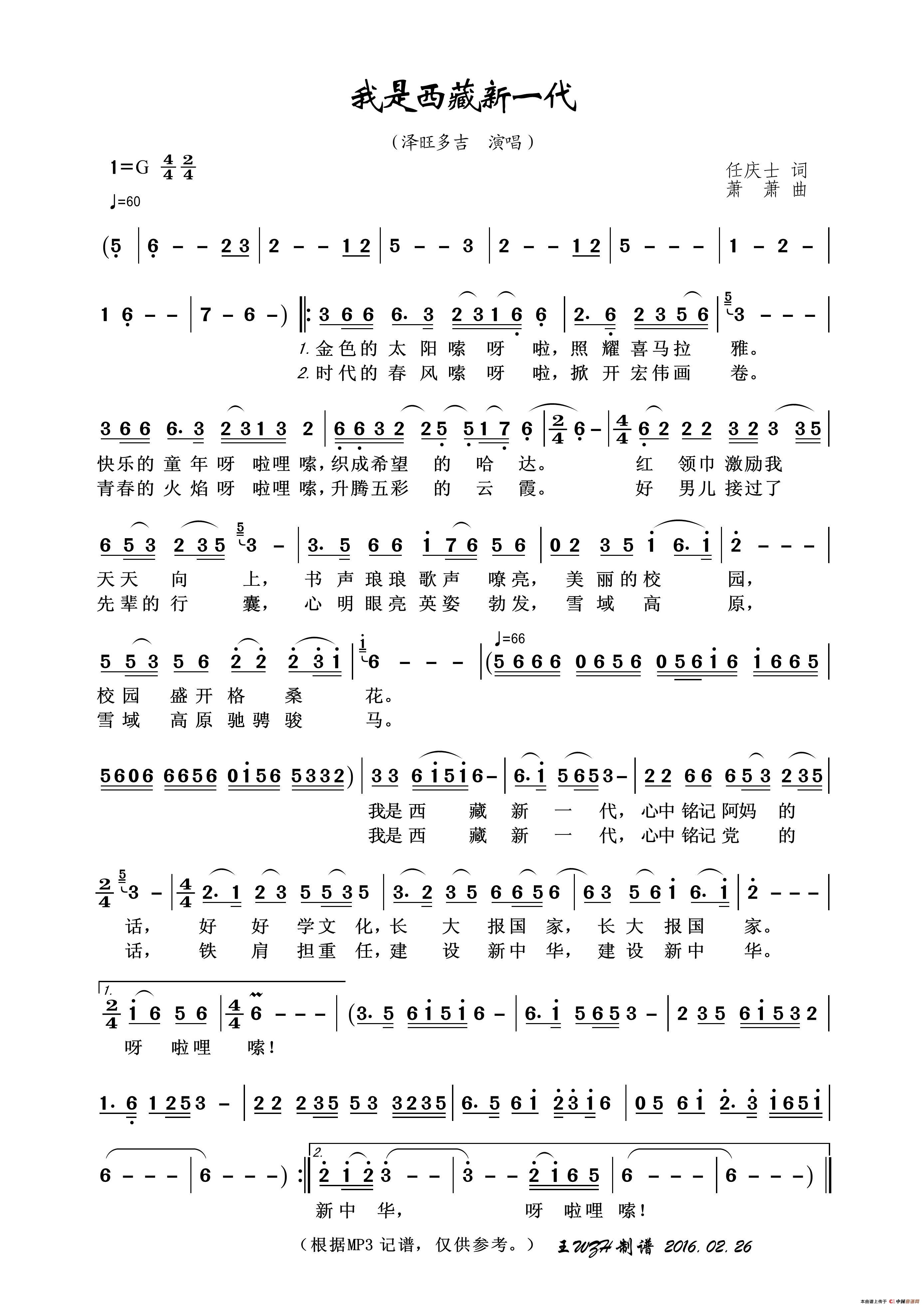 我是西藏新一代相关五线谱