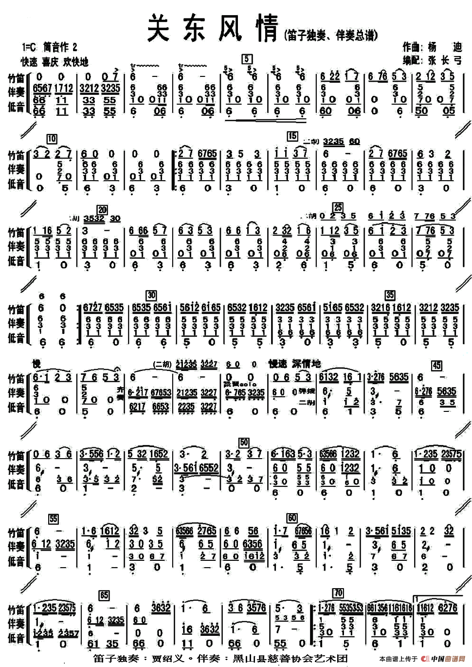 关东风情(笛子独奏曲+伴奏总谱、两页版本)相关五线谱