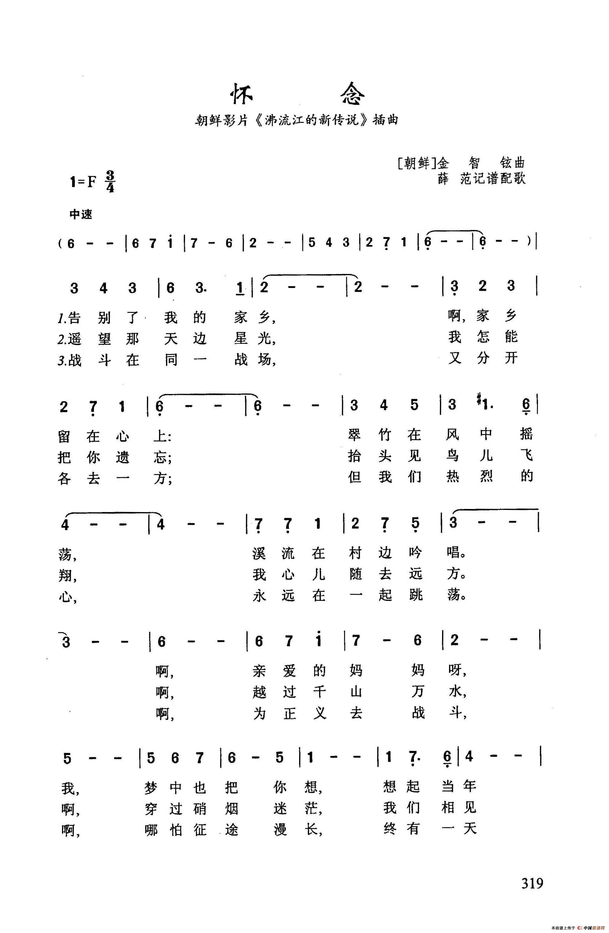 怀念(朝鲜影片《沸流江的新传说》插曲)相关五线谱