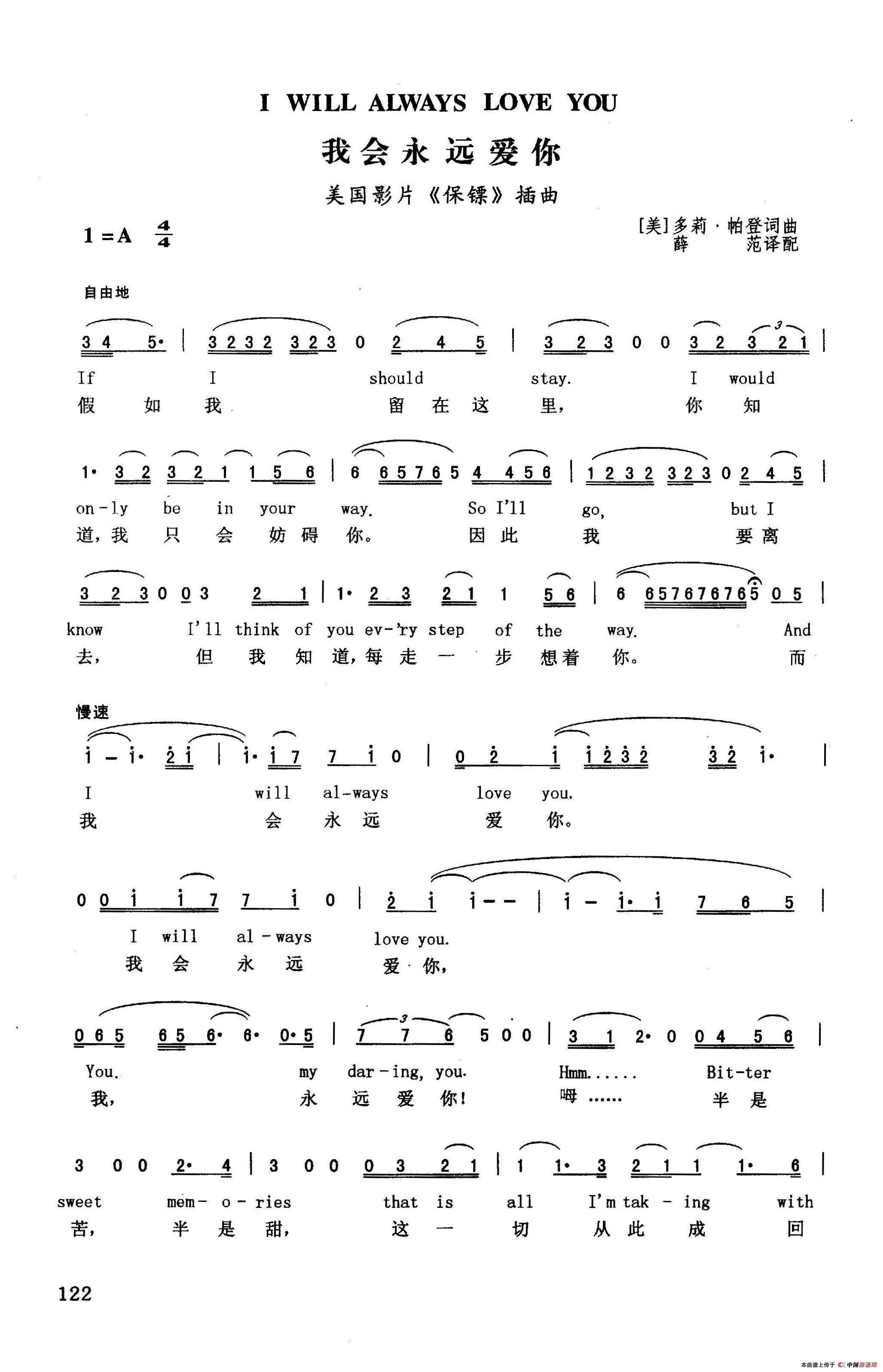 我会永远爱你(英汉)(美国影片《保镖》插曲)相关五线谱