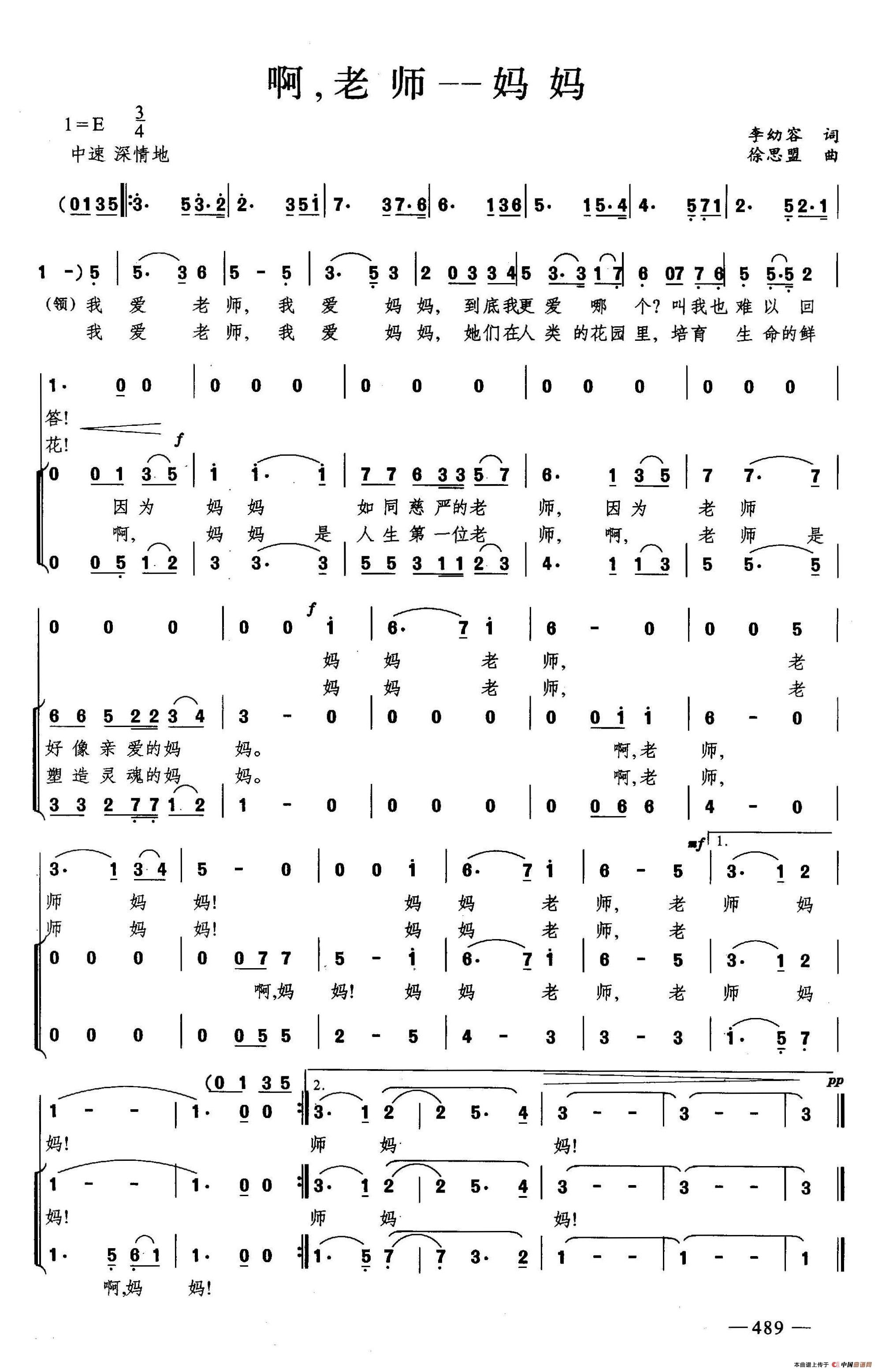 啊,老师-妈妈(合唱)相关五线谱