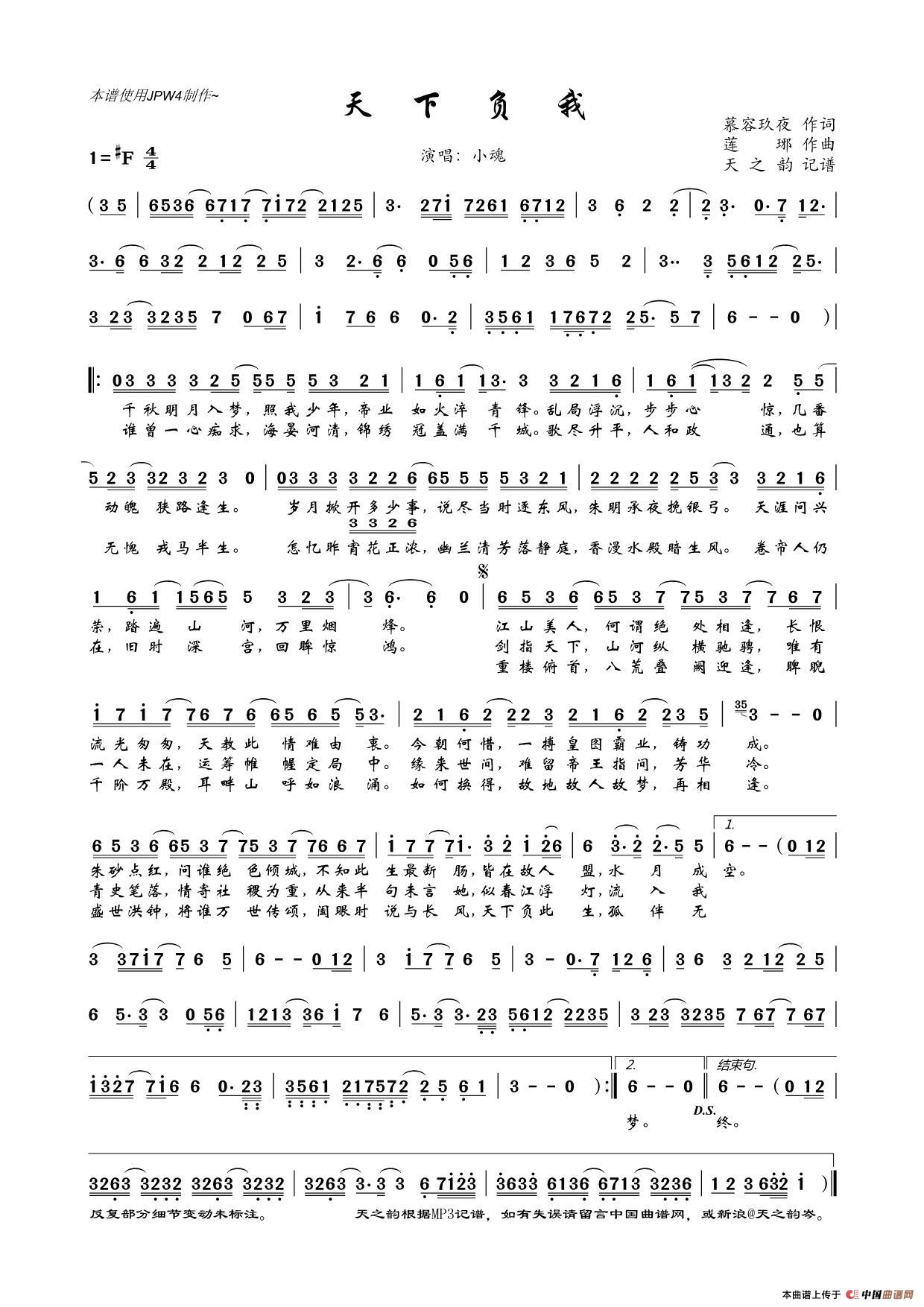 天下负我相关五线谱