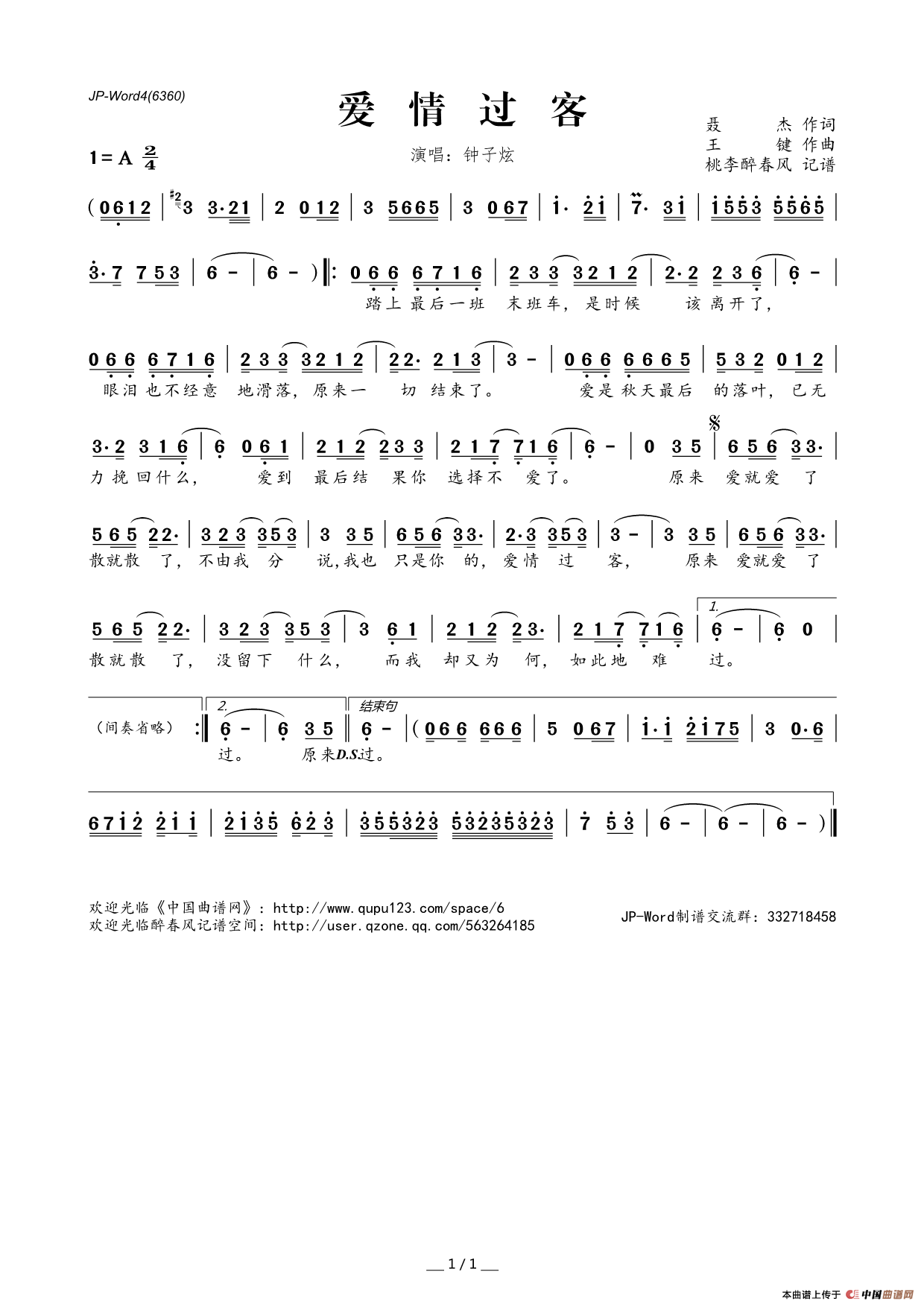 爱情过客相关五线谱