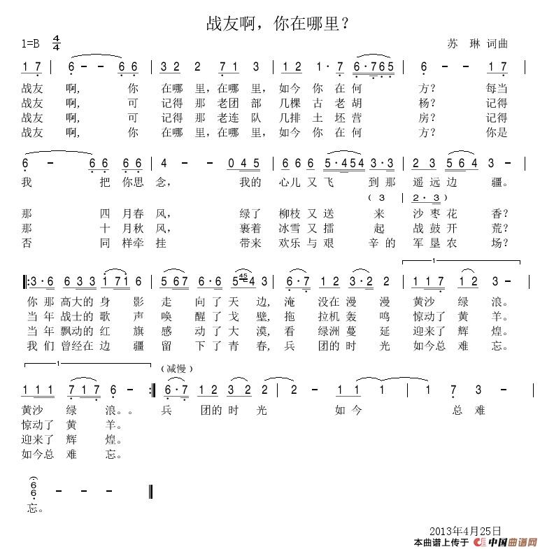 战友啊,你在哪里?相关五线谱