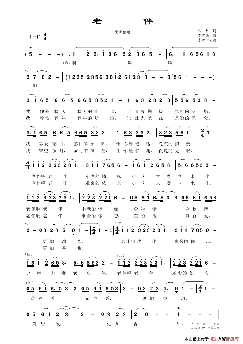 老伴(佚名词 李代勋曲)相关五线谱
