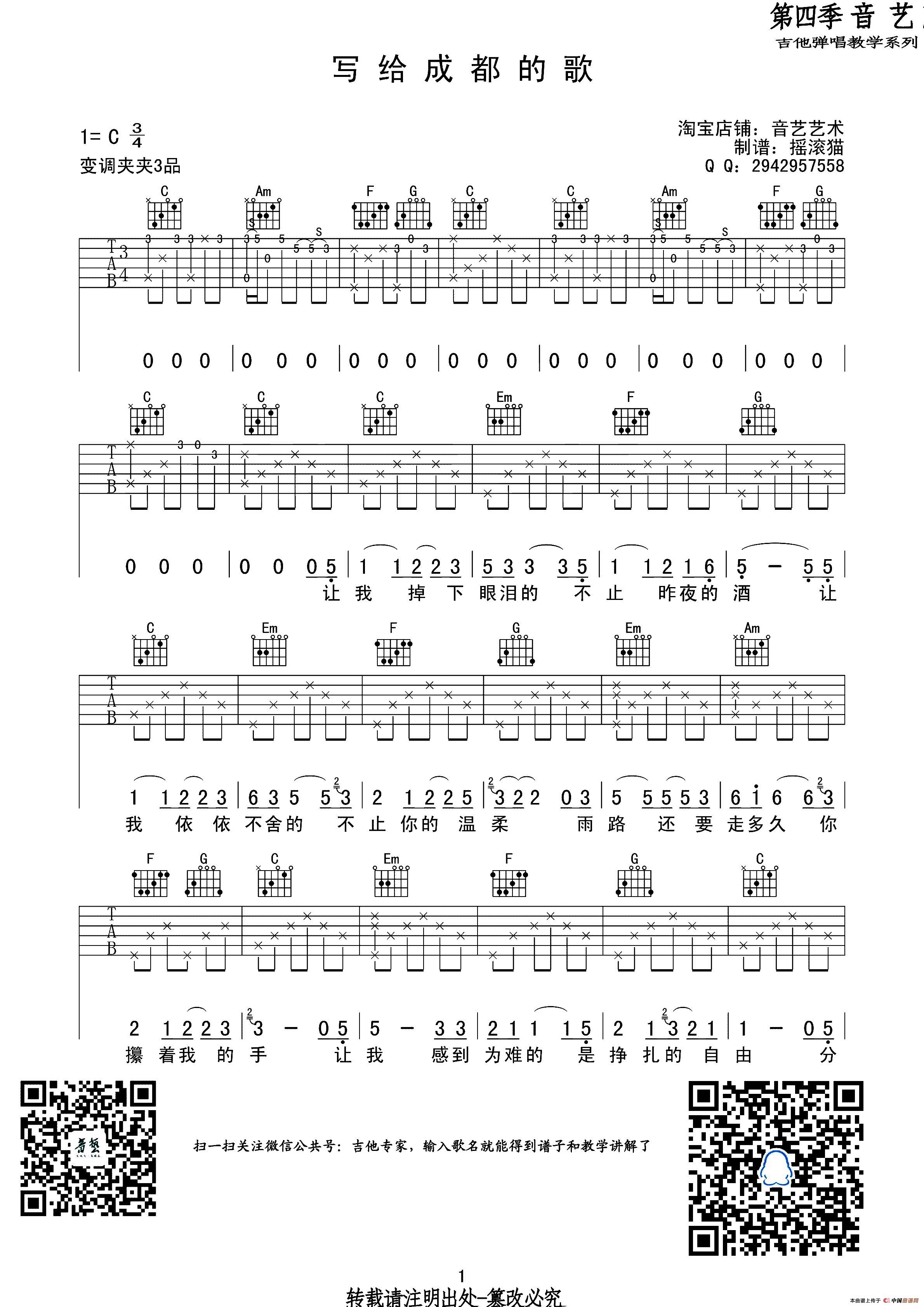 写给成都的歌(吉他六线谱)