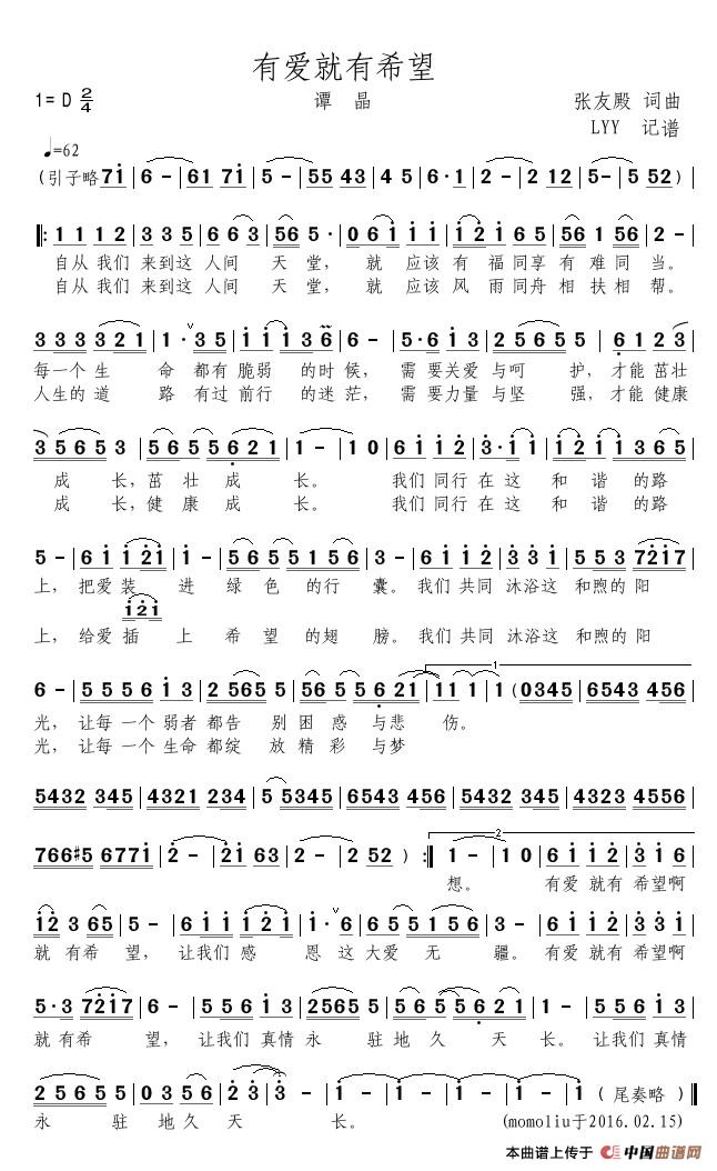 张友殿曲谱推荐我们一起走(张友殿词 张友殿曲)红军颂(张露平词 张友殿曲)葡萄香大爱暖天下(张友殿词曲)爱的呼唤中华手拉手(蔡国庆)等你回复远方的香格里拉(虞文琴词 张友殿曲)只为地球绿一片卓玛的故乡(金鸿为词 张友殿曲)共和国的春天(张友殿词曲)永恒的爱(张友殿词曲)和梦一起飞好福气(倪永东词 张友殿曲)永远的朋友(姜桂廷词 张友殿曲)感受祖国(吴广川词 张友殿曲)因为爱(张友殿词曲)让我的祖国更绿邀请春天给您拜个年
