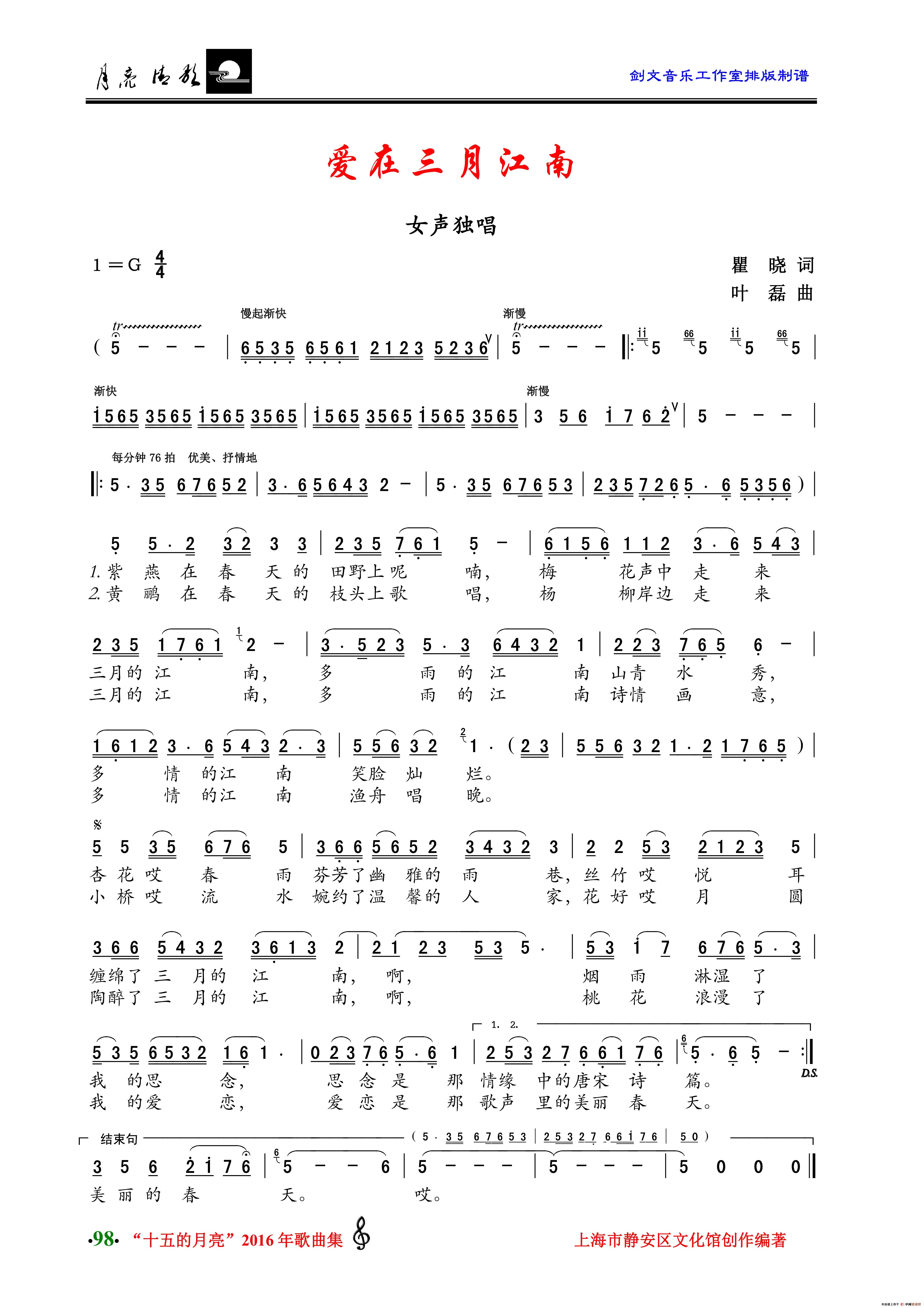 叶磊曲谱推荐我们为石泉贡献力量(合唱)姑娘和小鹿湘江红辣椒(小合唱)石泉迎宾曲(女声独唱)重走长征路(刘秉刚词 叶磊曲)故乡的脸阿妹望见牧鸭哥(沪歌)青春美(独唱)拿到金牌就送妈妈红星依旧耀中华(沪歌)新疆姑娘辫子长(合唱)中国人民警察警歌(合唱)每当我唱起国歌(肖正民词 叶磊曲)每当我唱起国歌(肖正民词 叶磊曲)丝竹悠悠唱江南(邹毅词 叶磊曲)妈妈的泪花(孙冰词 叶磊曲)湘江红辣椒(女声小合唱)江南小茶楼(华也词 叶磊曲)亲爱的朋友唱一支歌(男声独唱)太湖同学歌