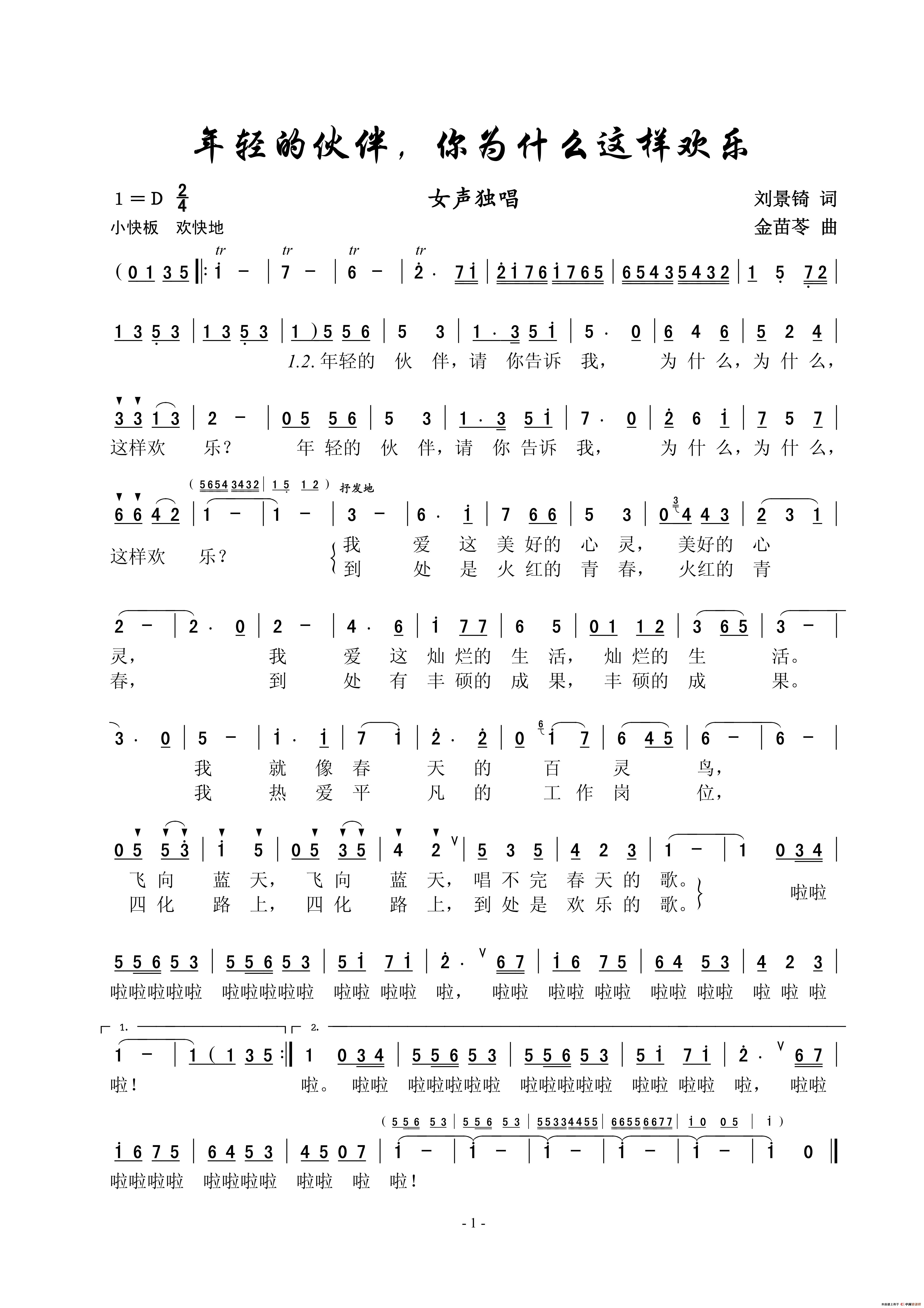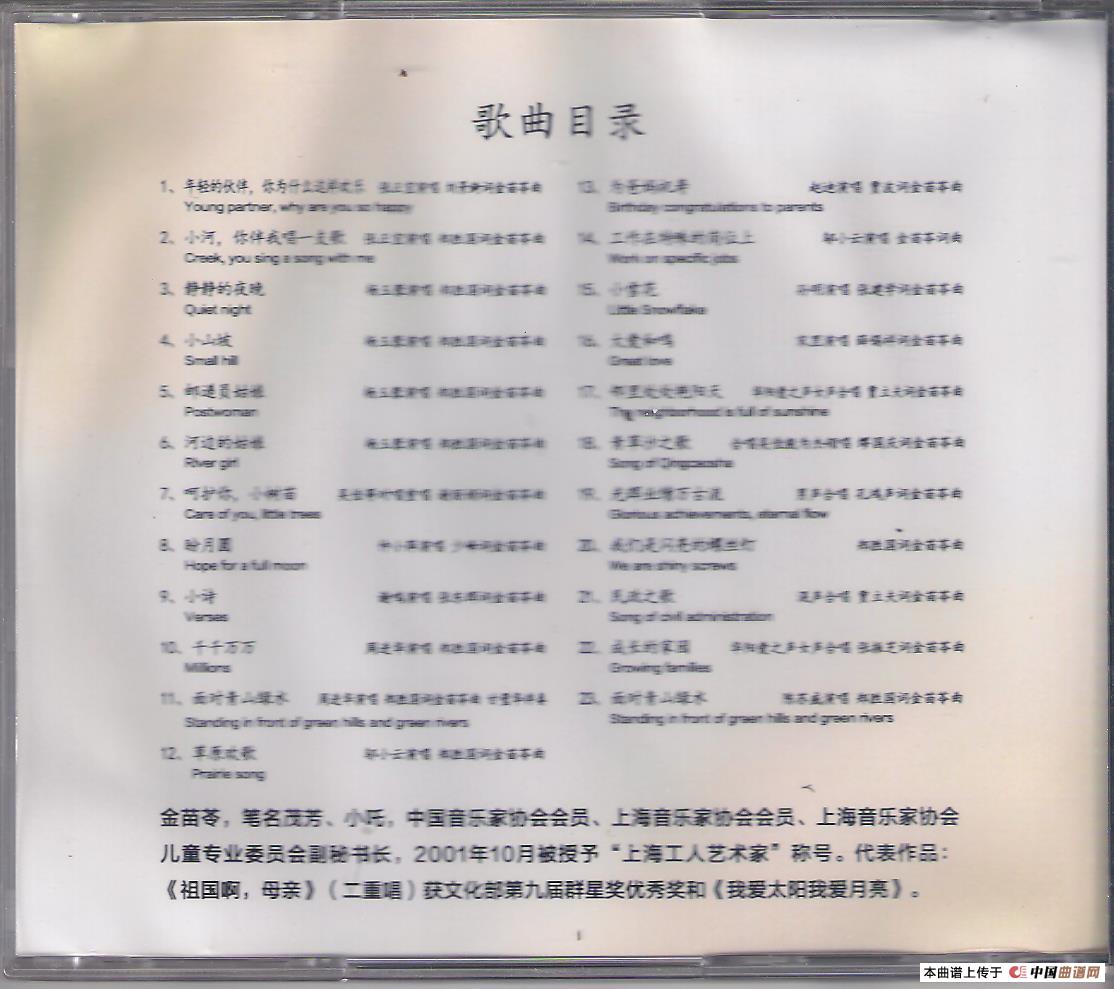 金苗苓曲谱推荐小河,你伴我唱一支歌(女声独唱)光辉业绩万古流(二重唱)嘉禾民歌永不落我在黄山等你来/豆豆(通俗女声独唱/)蔚蓝色的军礼(朱积聚词 金苗苓曲、二重唱)小胖墩儿长征,军号声声(男高音独唱)启东娃草原欢歌(郑胜国词 金苗苓曲)邮递员姑娘盼月圆(少峰词 金苗苓曲)我在黄山等你来(叶金剑词 金苗苓曲)童心的感恩(童声合唱)警钟长鸣(张立中词 金苗苓曲)苏河湾手拉手,向前走(汤昭智词 金苗苓曲、童声齐唱)遥远的问候(男高音独唱)毛爷爷走过的小路为爸妈祝寿慈善让中国更美丽(男女声二重唱)
