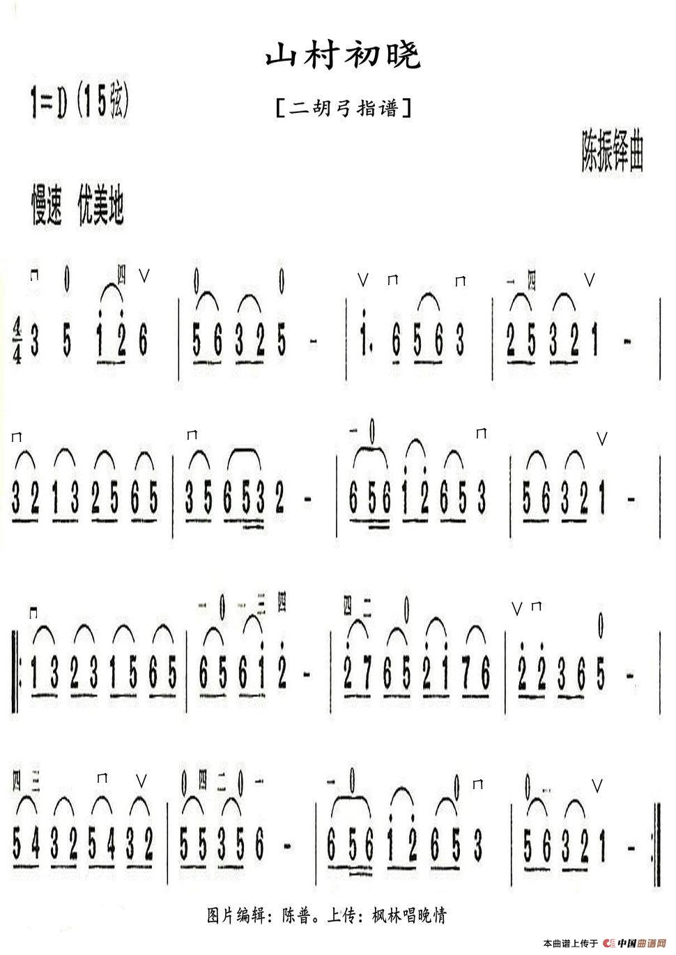 山村初晓(二胡弓指谱)相关五线谱