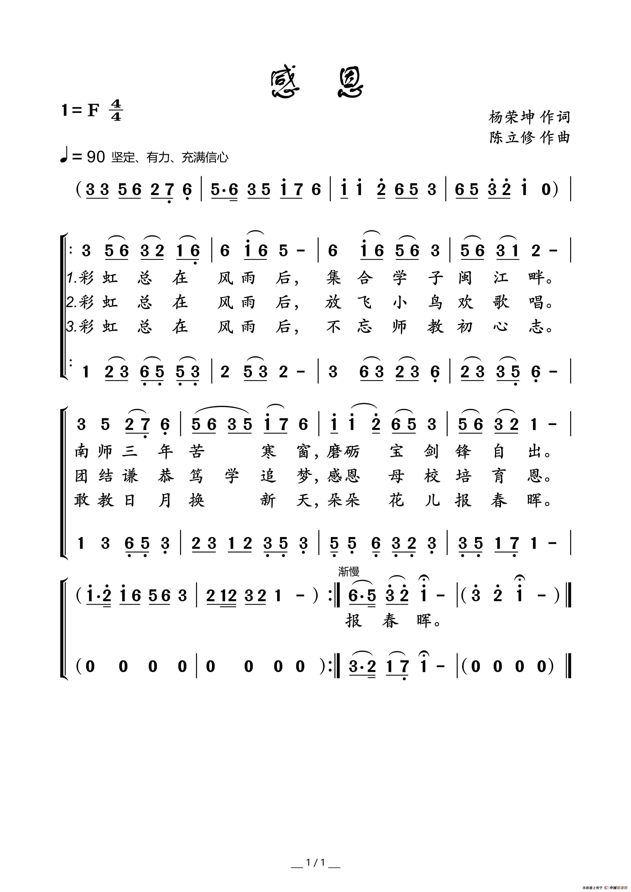 感恩(杨荣坤词 陈立修曲)相关五线谱