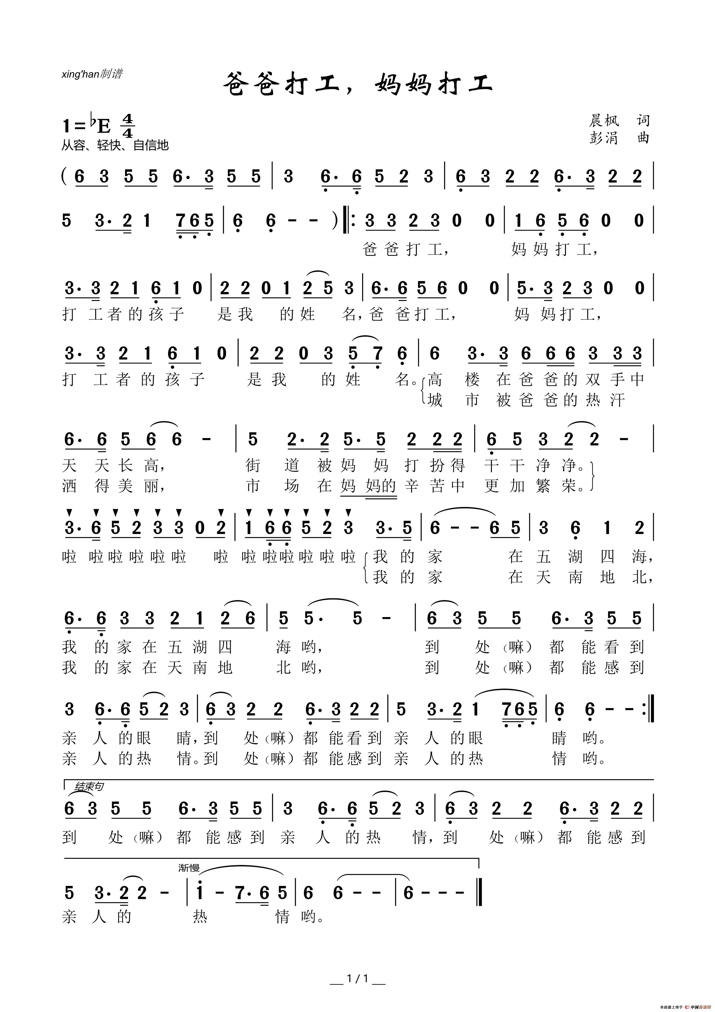 爸爸打工,妈妈打工(少儿歌曲)相关五线谱
