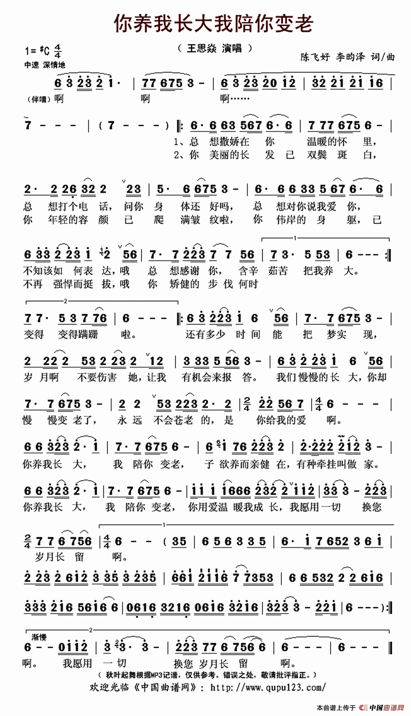 你养我长大我陪你变老(陈飞好 李昀泽词曲)相关五线谱