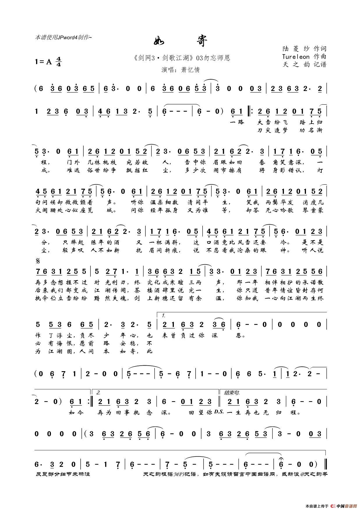 如寄(《剑网3·剑歌江湖》03勿忘师恩)相关五线谱