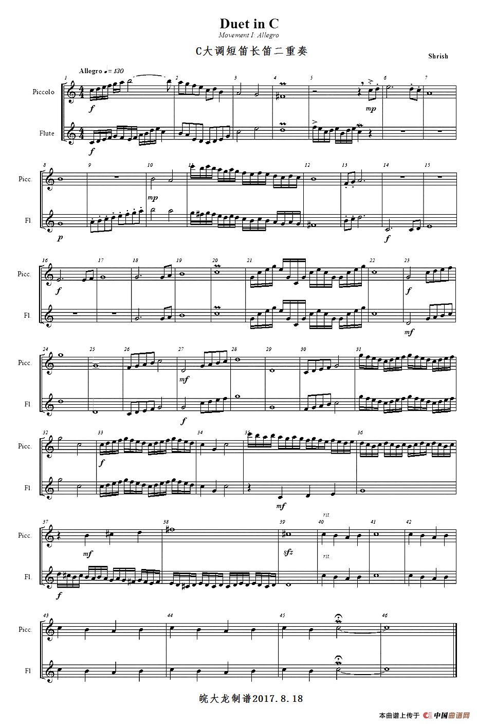 C大调 短笛、长笛二重奏