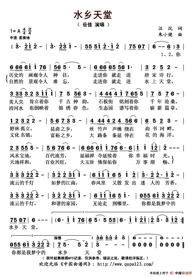 水乡天堂(汪沉词 朱小健曲)相关五线谱