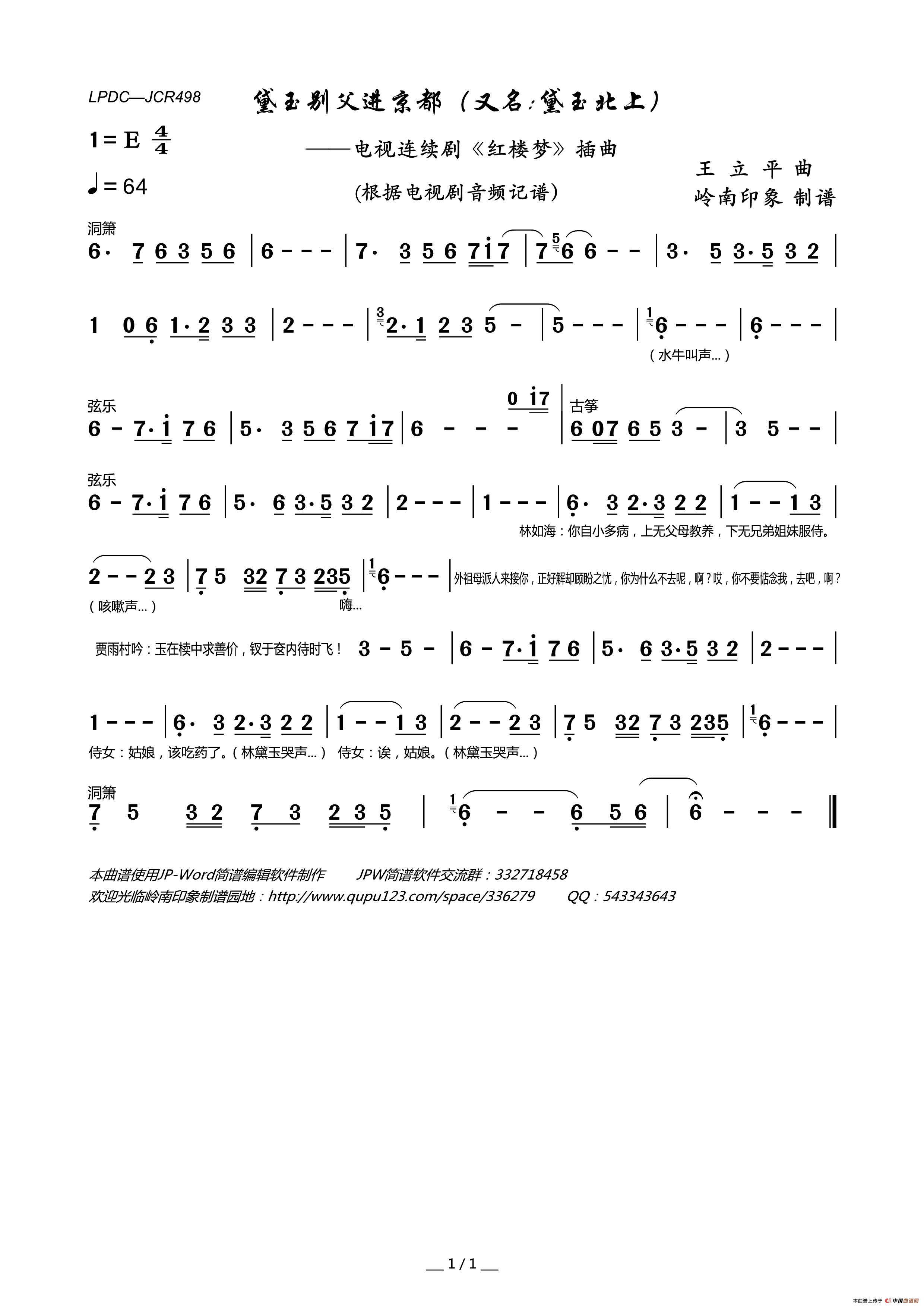 王立平曲谱推荐枉凝眉(电视连续剧《红楼梦》主题曲)大海啊,故乡(又名:大海啊故乡)(电影《大海在呼唤》主题歌)乡恋驼铃秋窗风雨夕(正谱)彩翼飞九天江河万古流(电视片《九州方圆》主题歌、正谱)七彩桥(儿童电视专题片《节日的七彩桥》主题歌)枉凝眉(87版电视连续剧《红楼梦》主题歌)驼铃(电影《戴手铐的旅客》插曲)飞吧,鸽子(洪源词 王立平曲 冯晓阳编合唱)雪花(刘舒章词 王立平曲)青玉案(马凯词 王立平曲)我们正青春江河万古流民族声乐考级歌曲:说聊斋浪花里飞出欢乐的歌太阳岛上(电视片《哈尔滨的夏天》插曲 )葬花吟(87版电视剧《红楼梦》插曲)毛主席诗词交响组歌:沁园春·长沙