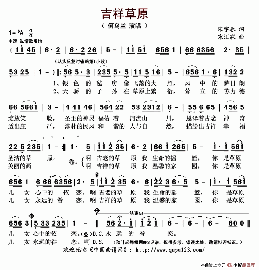 宋汇霖曲谱推荐我的马头琴(白立平词 宋汇霖曲)辙迹红山,我的祖山经过毡房高天厚土的中国那是我的大草原(王燃词 宋汇霖曲)我的阿妈,我的草原天边不再遥远经过毡房(赵星诺)一个遥远的地方可是你又经过我的毡房