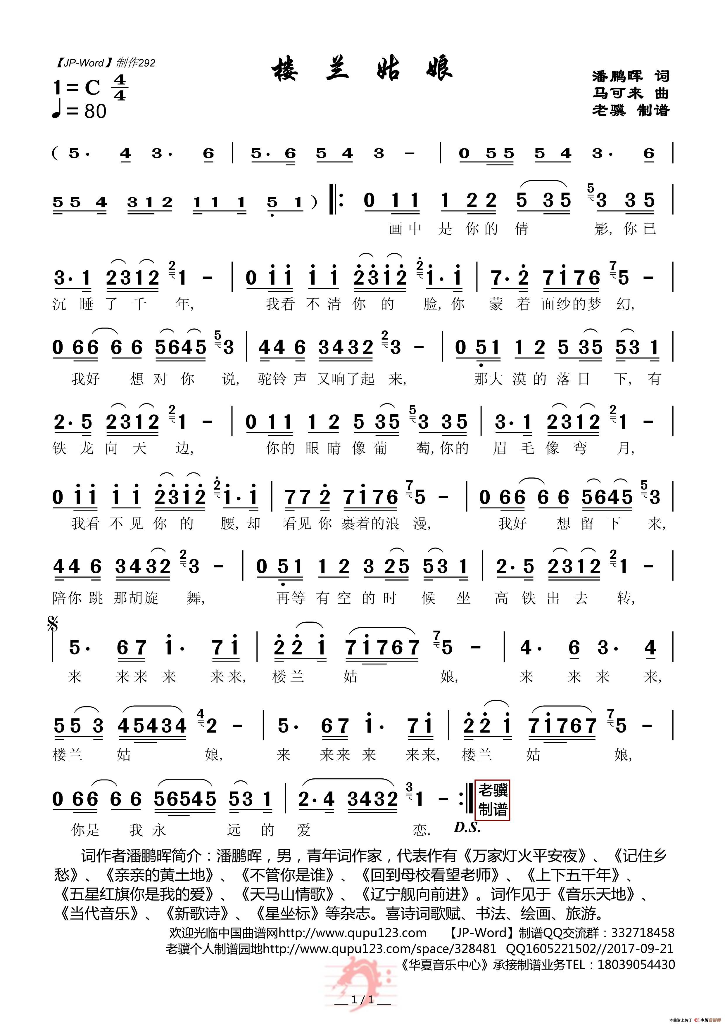 楼兰姑娘(潘鹏晖词 马可来曲)相关五线谱