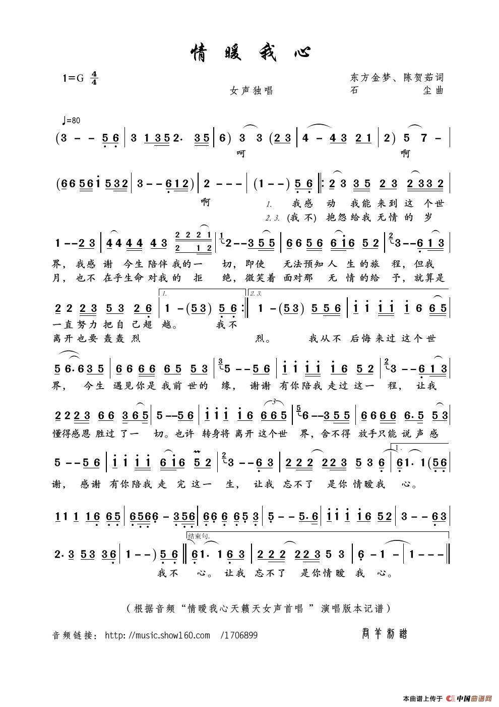 情暖我心(东方金梦、陈贺茹词 石尘曲)相关五线谱