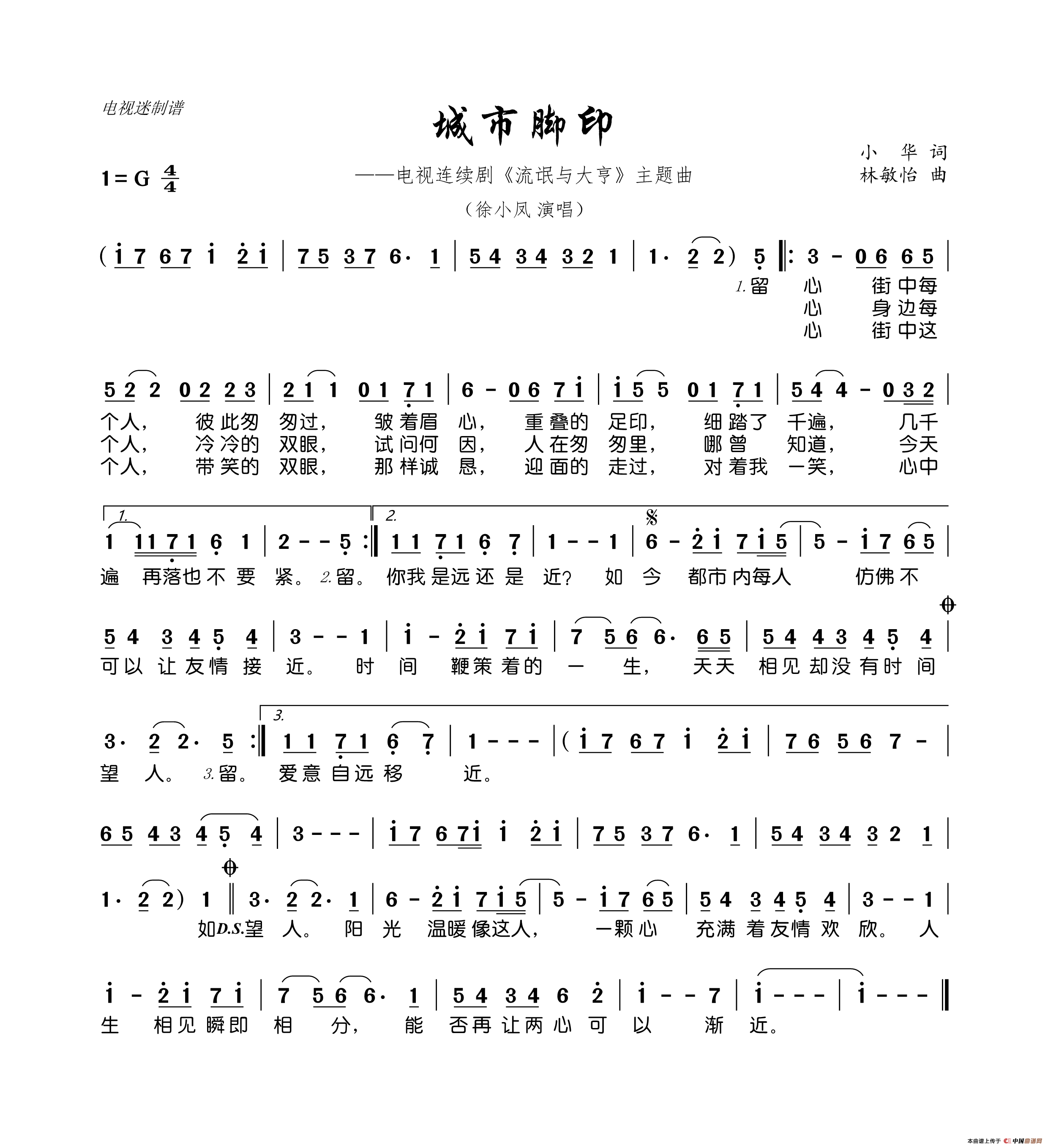 林敏怡曲谱推荐城市足印(电视剧《大亨恩仇》主题曲)城市足印(香港电视连续剧《流氓大亨》主题曲)苏芮演唱金曲:只有夜知道和平之歌(郑国江词 林敏怡曲)幻影怎会爱着你(王国潼编曲)倾城之恋苏芮演唱金曲:谁可相依(电影《龙的心》主题歌)还有明天(香港电视剧《边城浪子》主题曲)苏芮演唱金曲:车站(电影《富贵列车》主题歌)信