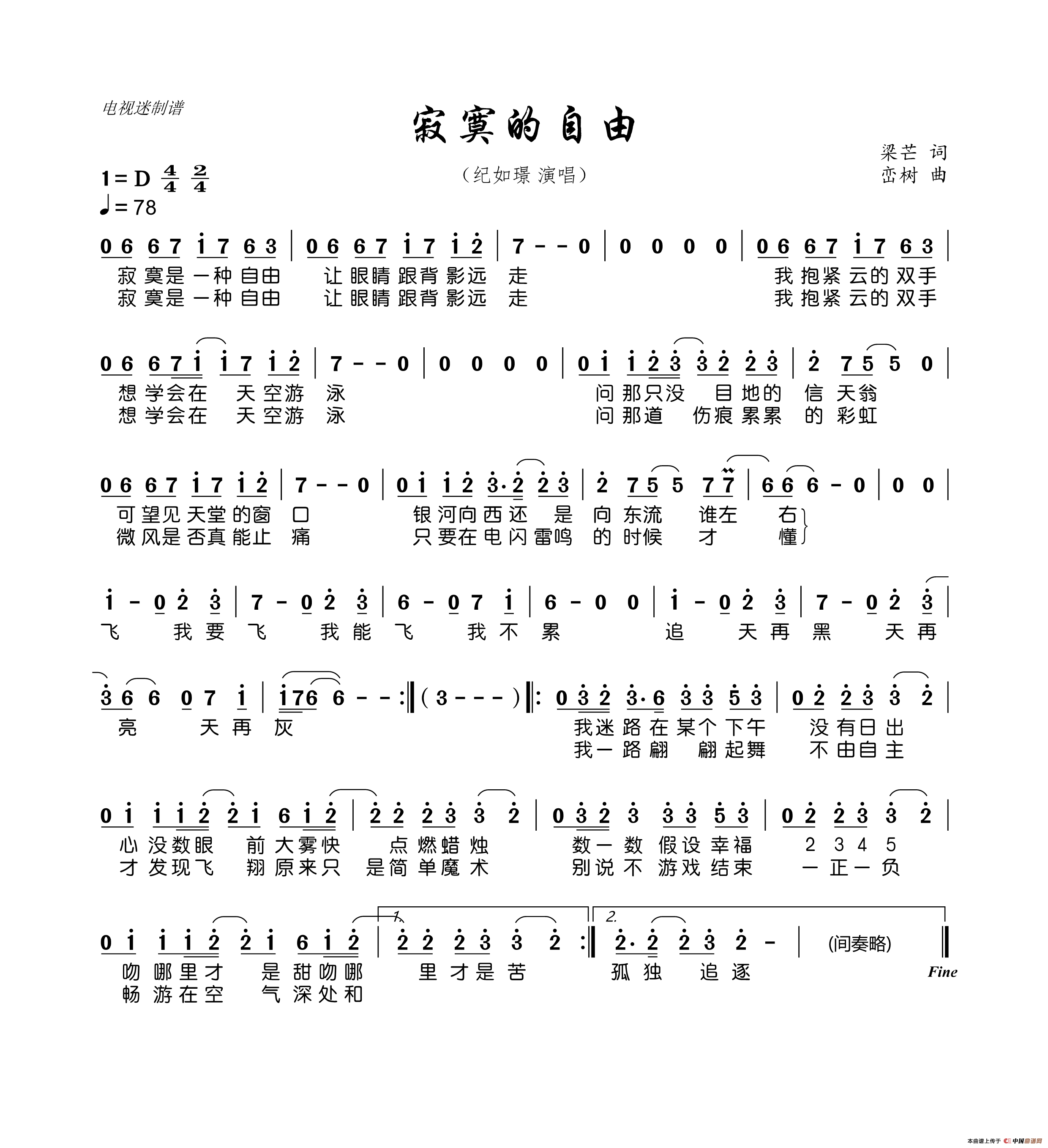 寂寞的自由相关五线谱