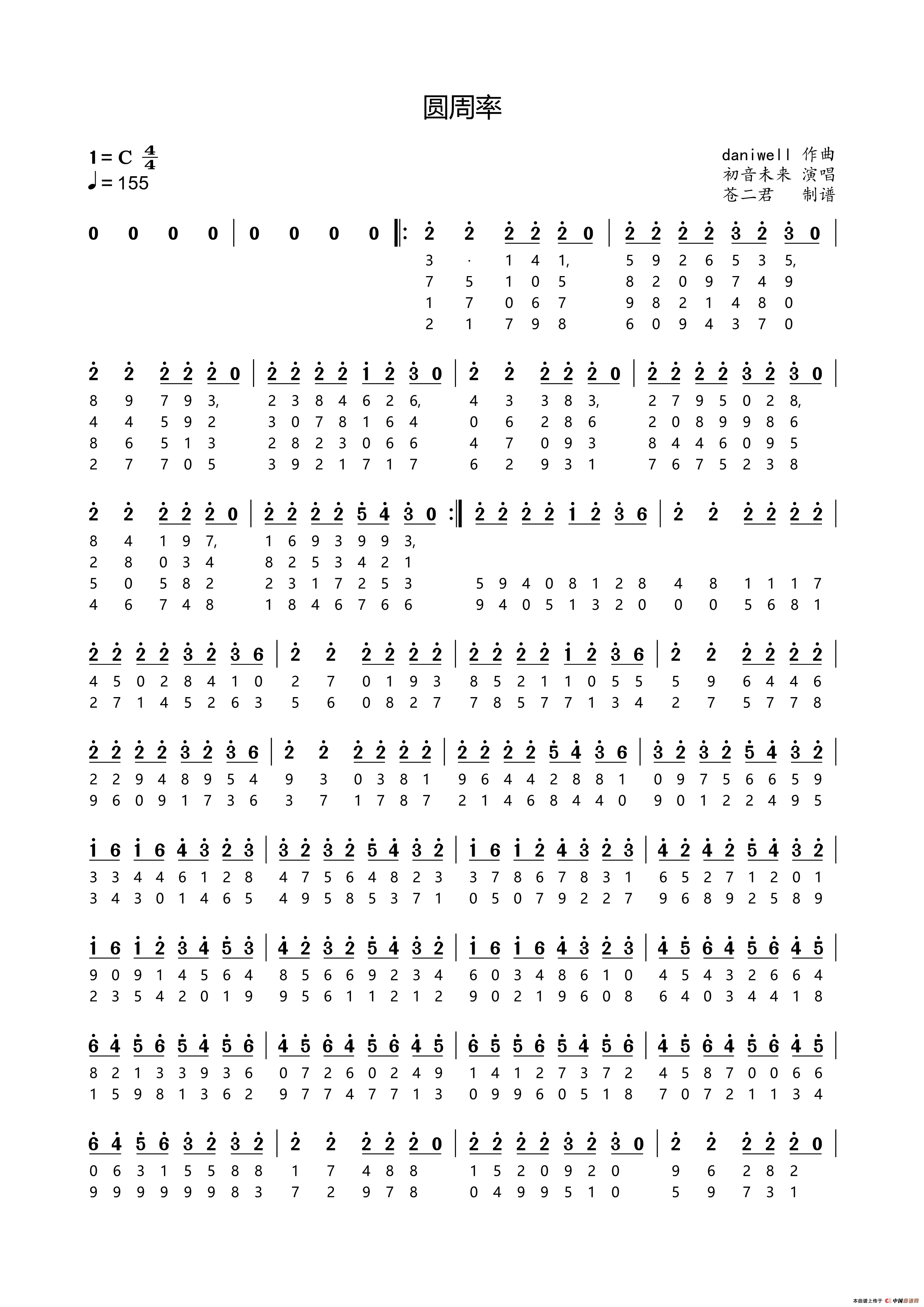 [日]圆周率(1000位版本)(Vocaloid神话曲)相关五线谱