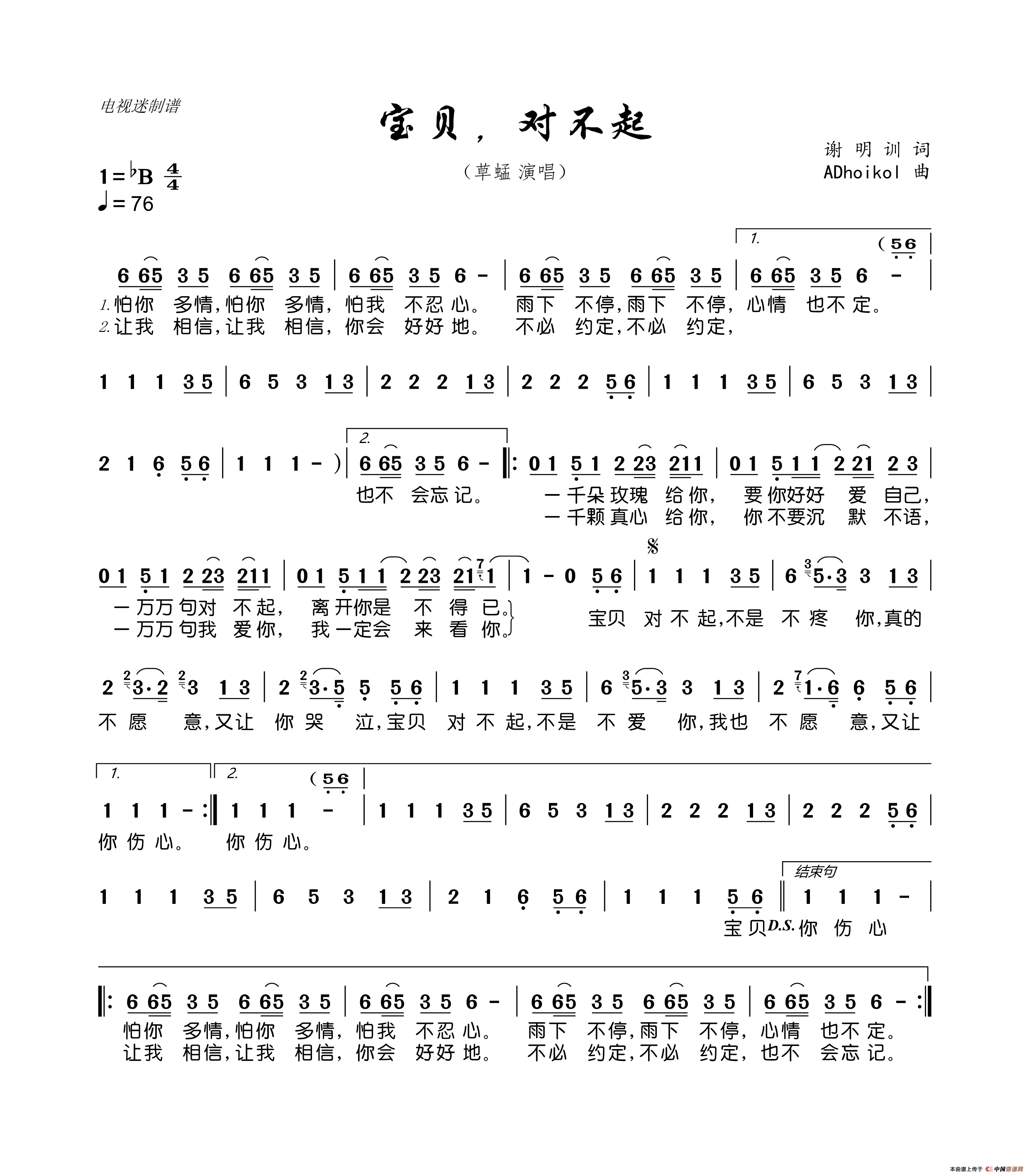 宝贝,对不起相关五线谱