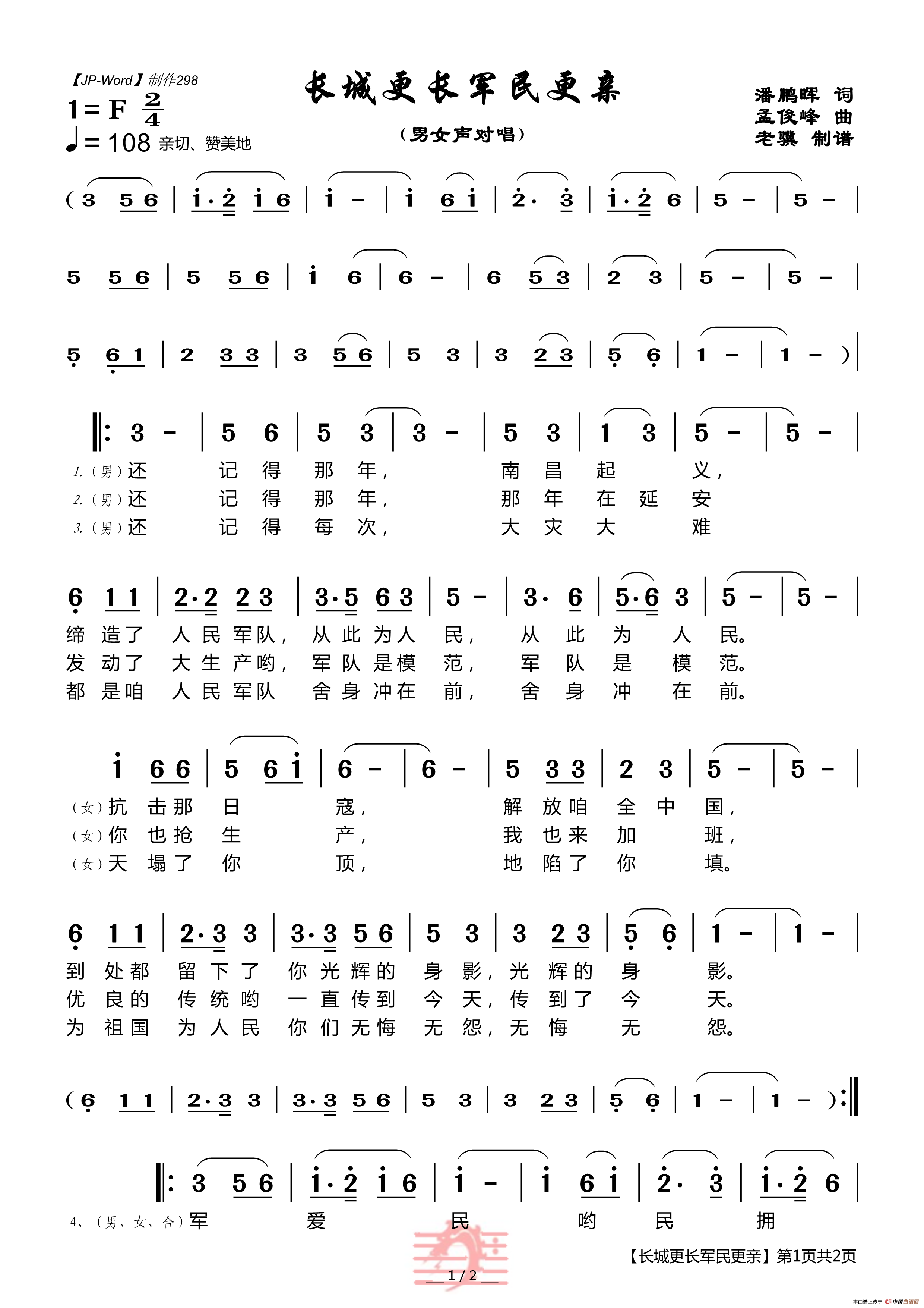 长城更长军民更亲(潘鹏晖词 孟俊峰曲)相关五线谱