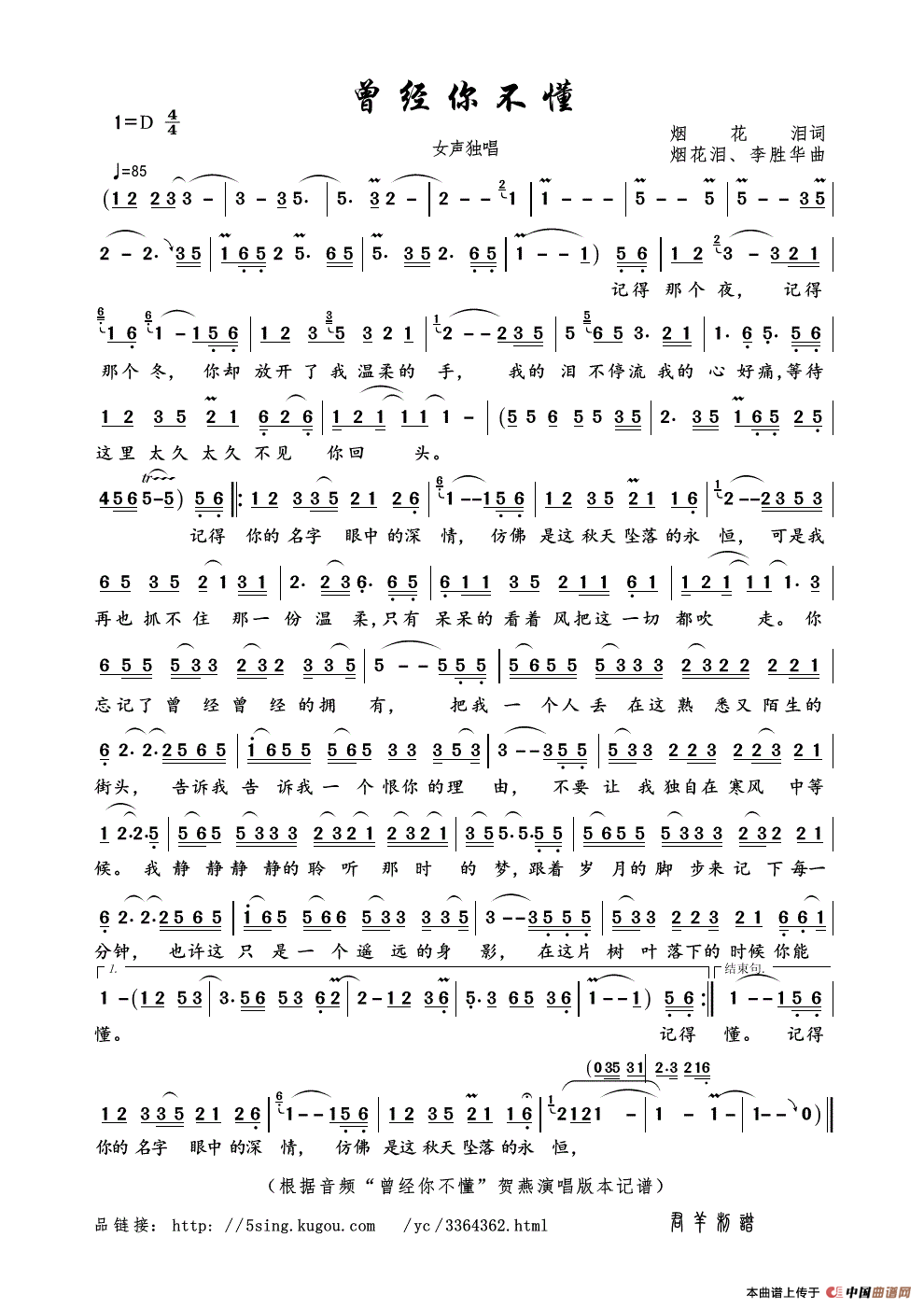 曾经你不懂(烟花泪词 烟花泪、李胜华曲)相关五线谱