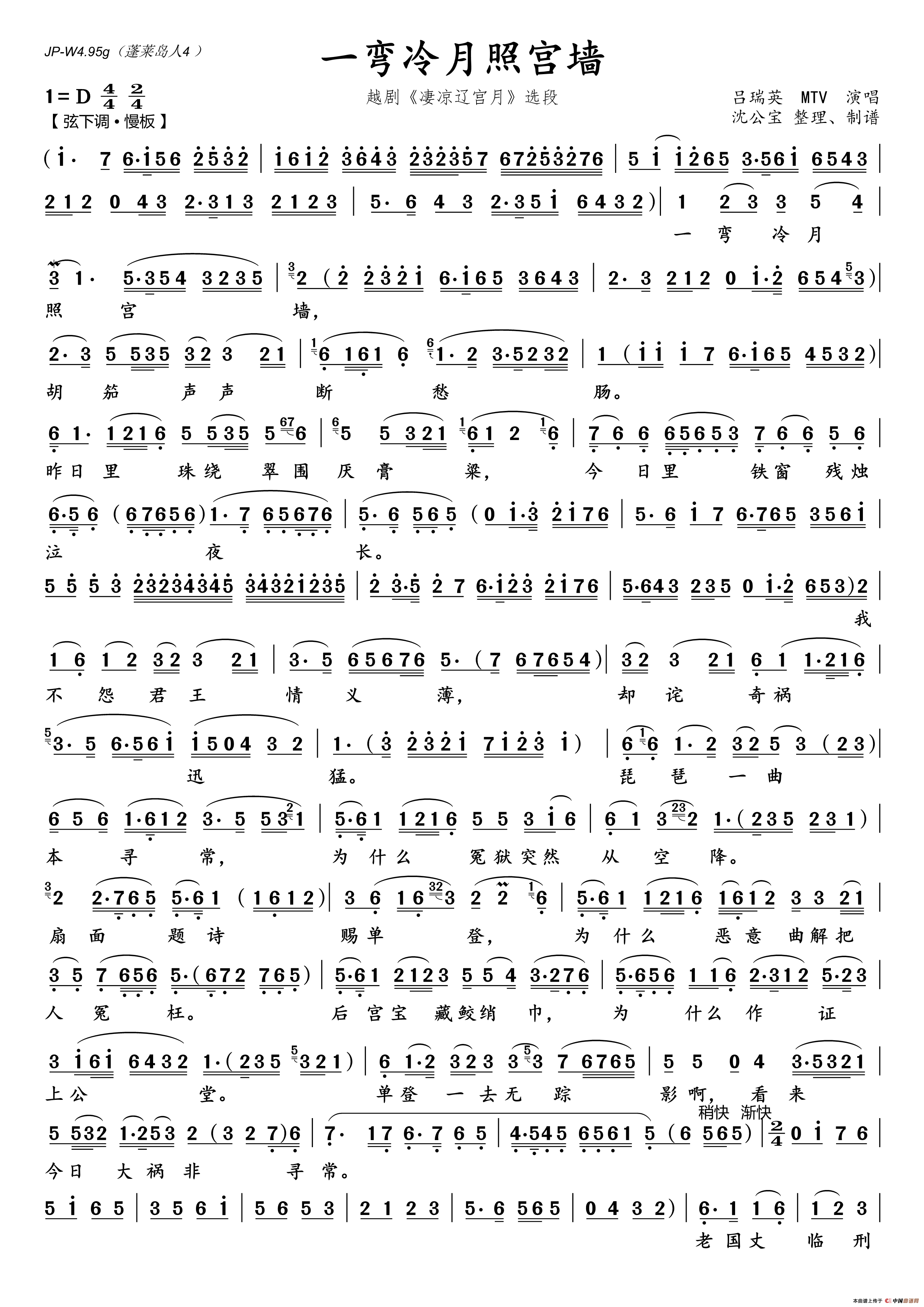 一弯冷月照宫墙(越剧《凄凉辽宫月》选段)相关五线谱