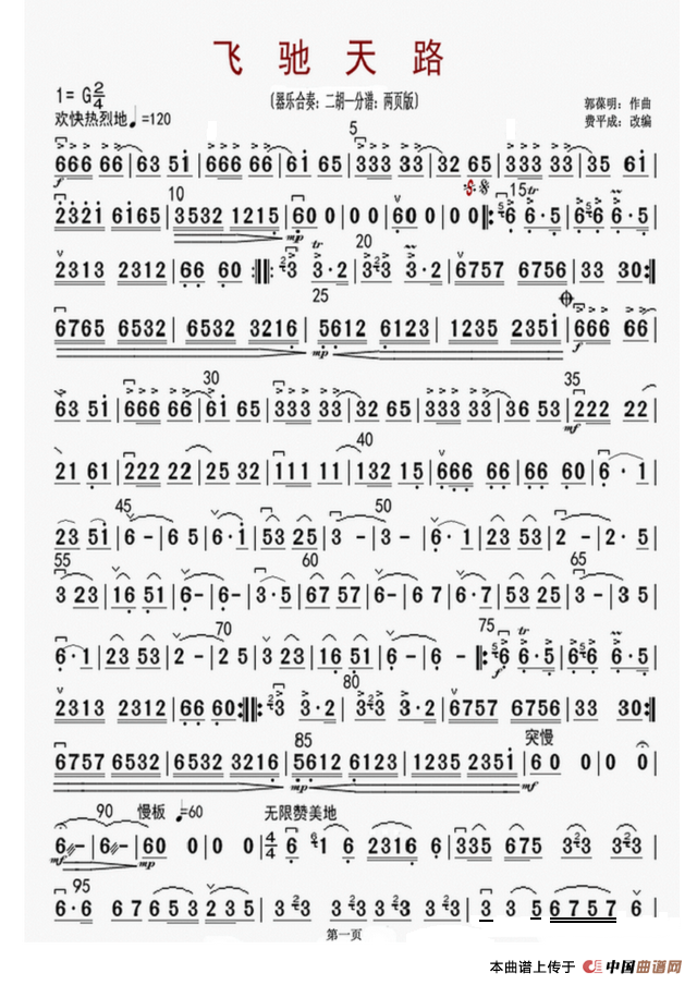 飞驰天路(器乐合奏:二胡(—)分谱:两页版)相关五线谱