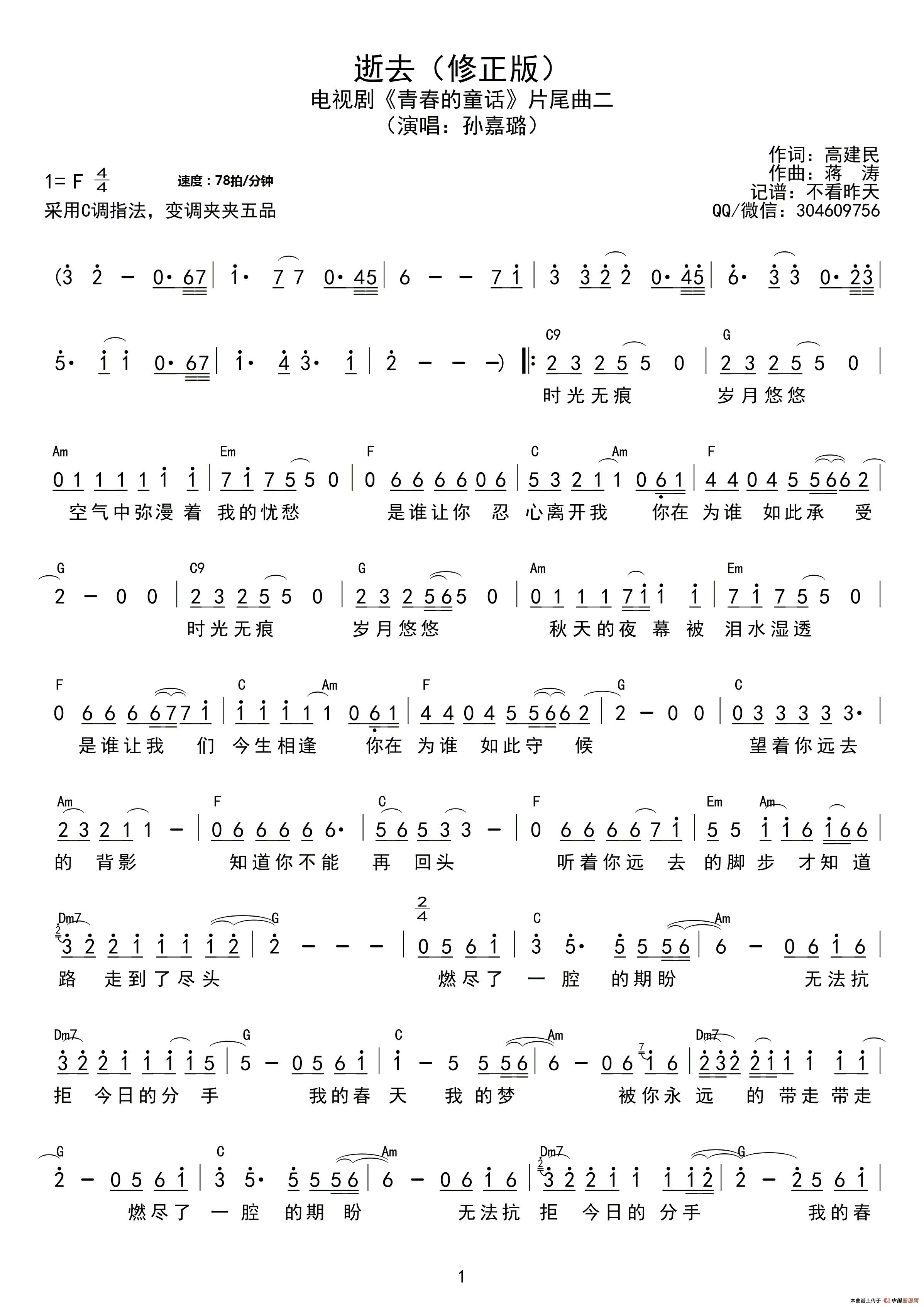 逝去(青春的童话简谱、《青春的童话》片尾曲简谱、简谱、和弦谱、简谱+和弦谱、孙嘉璐简谱)