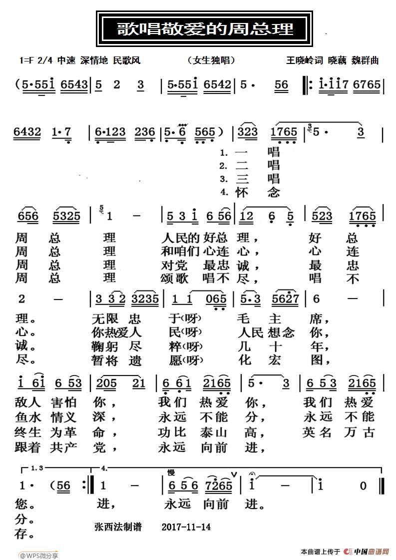 歌唱敬爱的周总理相关五线谱