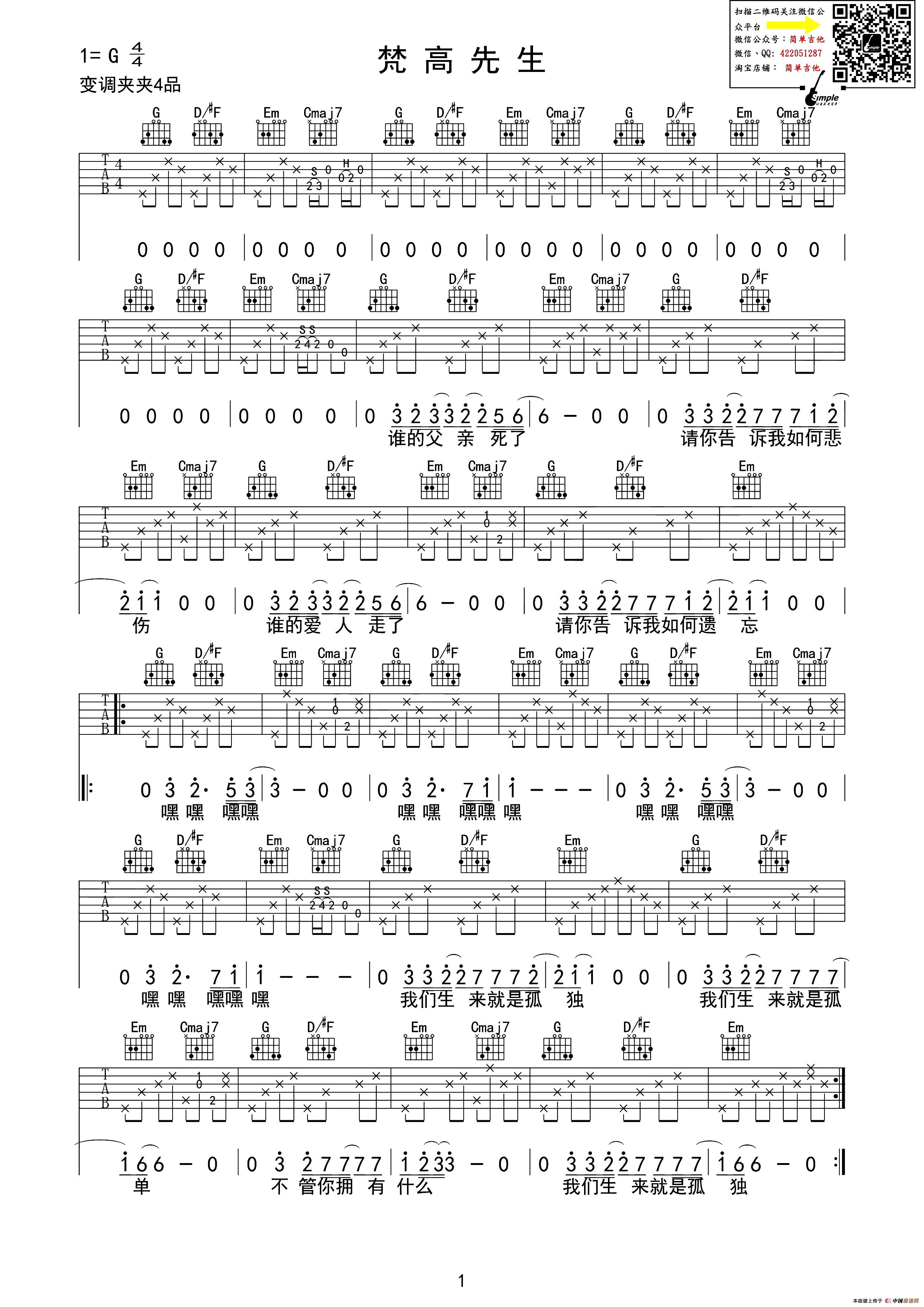 梵高先生(吉他六线谱、简单吉他编配版)