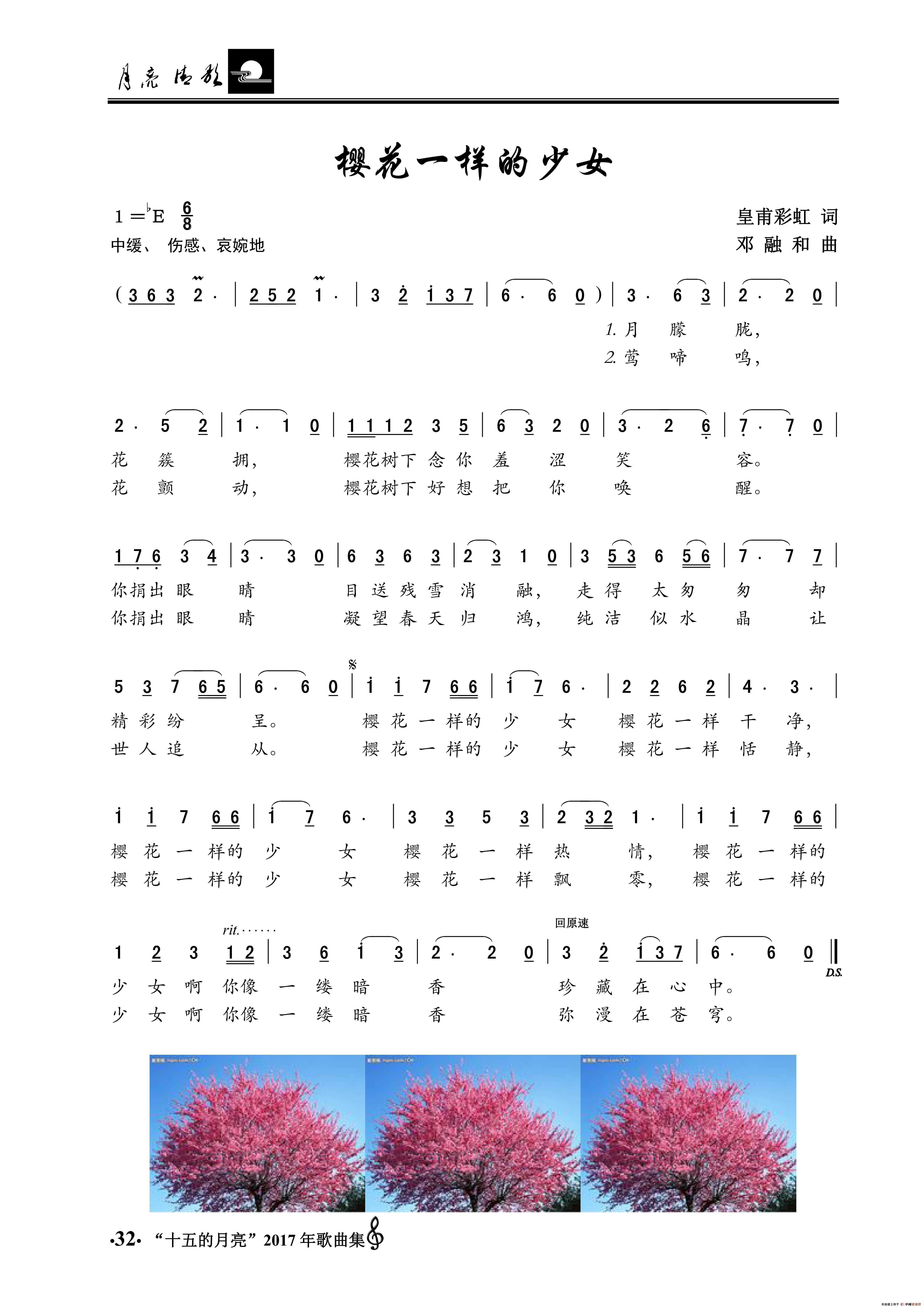 邓融和曲谱推荐距离(蒋言礼词 邓融和曲)恩师颂妈妈,来我梦里吧/迷路的小花鸭好苹果(何也词 邓融和曲)花季圆舞曲中国梦,闸北情都把好歌唱两只小猪瞎嘀咕小马过河(李道一词 邓融和曲)蓝眼睛 黄眼睛和谐圆舞曲(朱积聚词 邓融和曲)百姓论道我们的夏令营我们的好时光小兔吃草圣诞树两个月亮(何也词 邓融和曲)谁说不孝顺(养老院院歌)幸福地久天长林姑娘(何也词 邓融和曲)中国家谱
