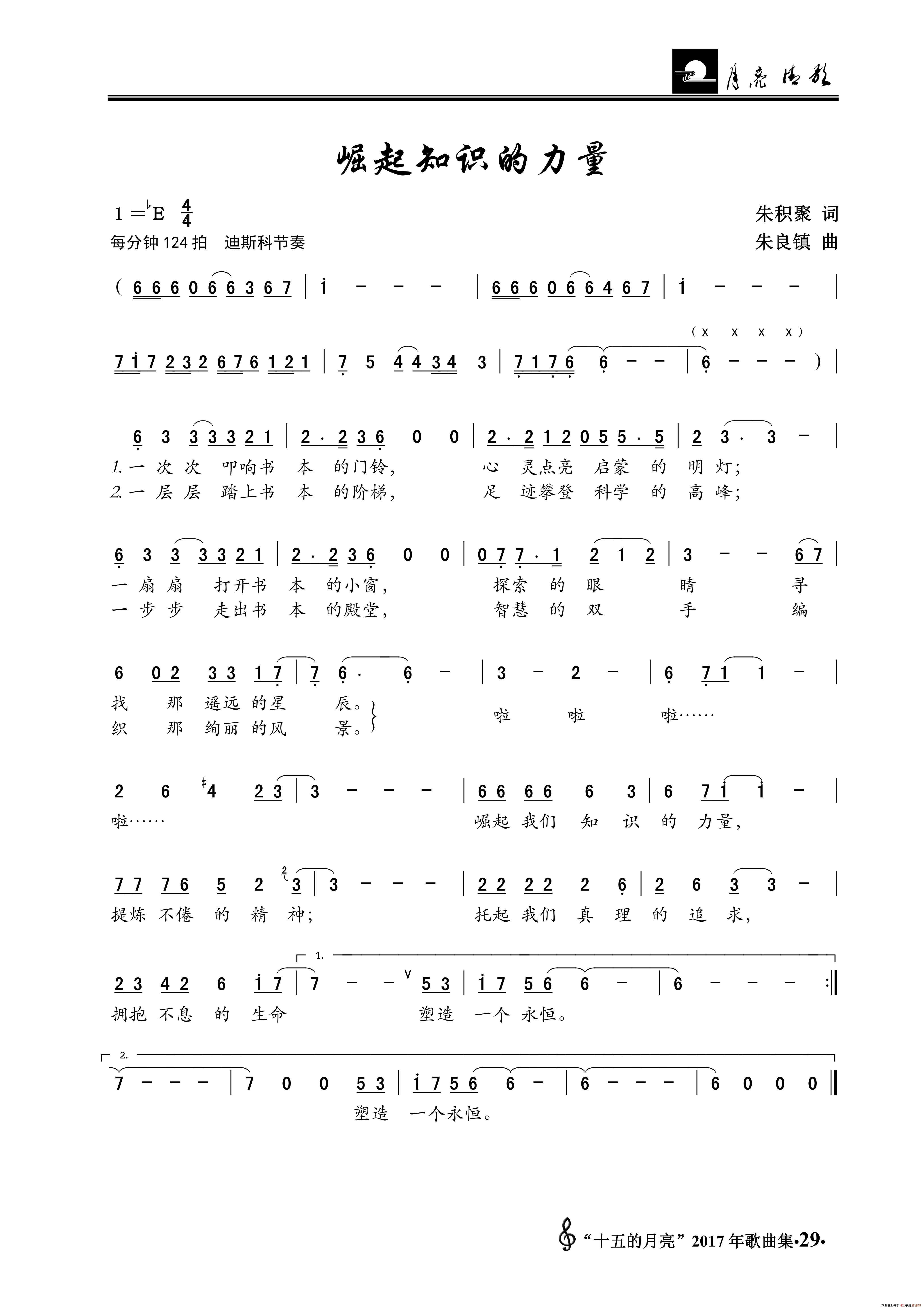 朱良镇曲谱推荐爱的诗篇(三声部合唱)跨世纪的远航郊外的小路(朱积聚词 朱良镇曲)两地曲两地曲(大乐队伴奏分谱)两地曲(声乐及伴奏总谱)让世界都赞美你(正谱)祖国 我深深地爱你(黄淑子词 朱镇良曲)没有你们哪有我们两地曲太阳的儿子(D调正谱)2祖国,我为你尽情歌唱(双谱)两地曲两地曲眷恋在故土青春潇洒太阳的儿子(正谱)这世界太狭小(电视连续剧《大酒店》主题歌)让世界都赞美你(吴善翎词 朱良镇曲)月色迷人夜